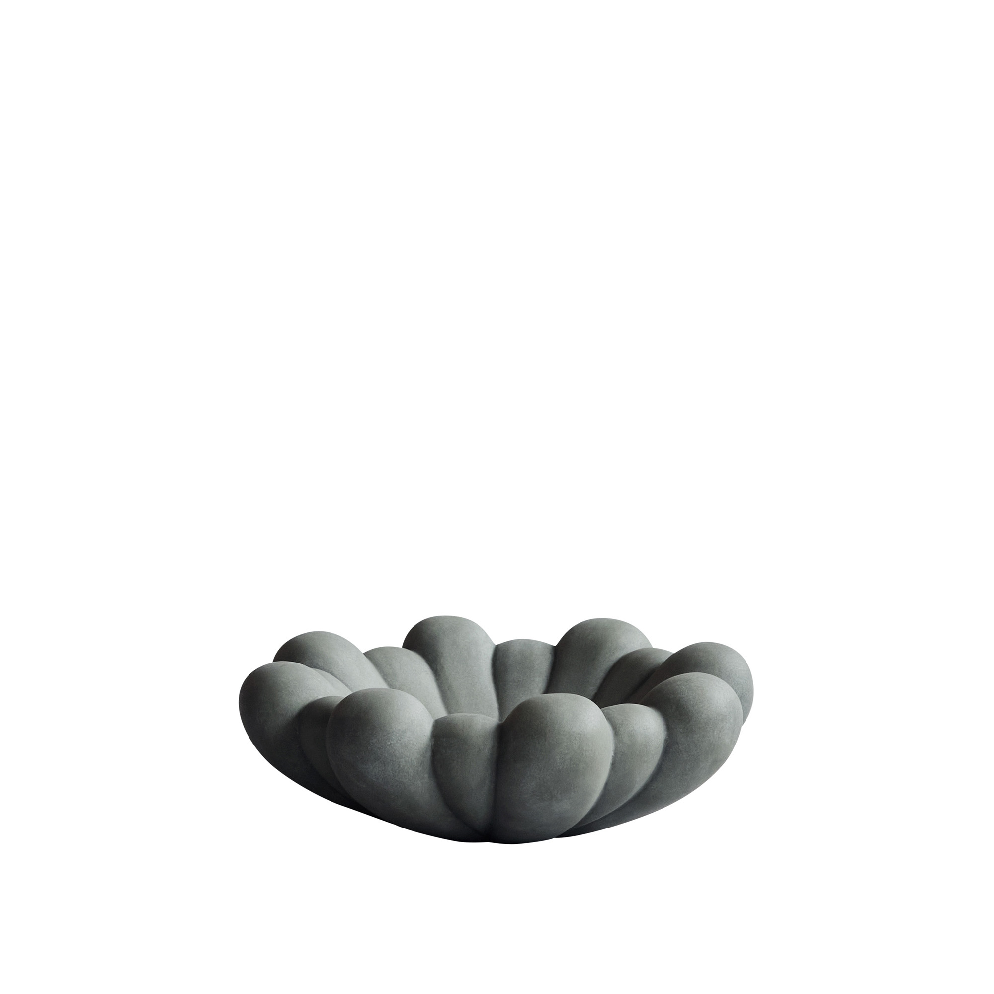 Bloom Tray Medio från 101 Copenhagen är en bred skål designad av Kristian Sofus Hansen och Tommy Hyldahl. Den har en skulptural form inspirerad av blommors utveckling från knopp till blomning. Skålen kombinerar rå geometri med mjuka, organiska former och spelet mellan ljus och skugga ger en dynamisk känsla. Tillverkad i keramik och fiberbetong med en handglaserad yta som ger en unik textur och små variationer i färg.