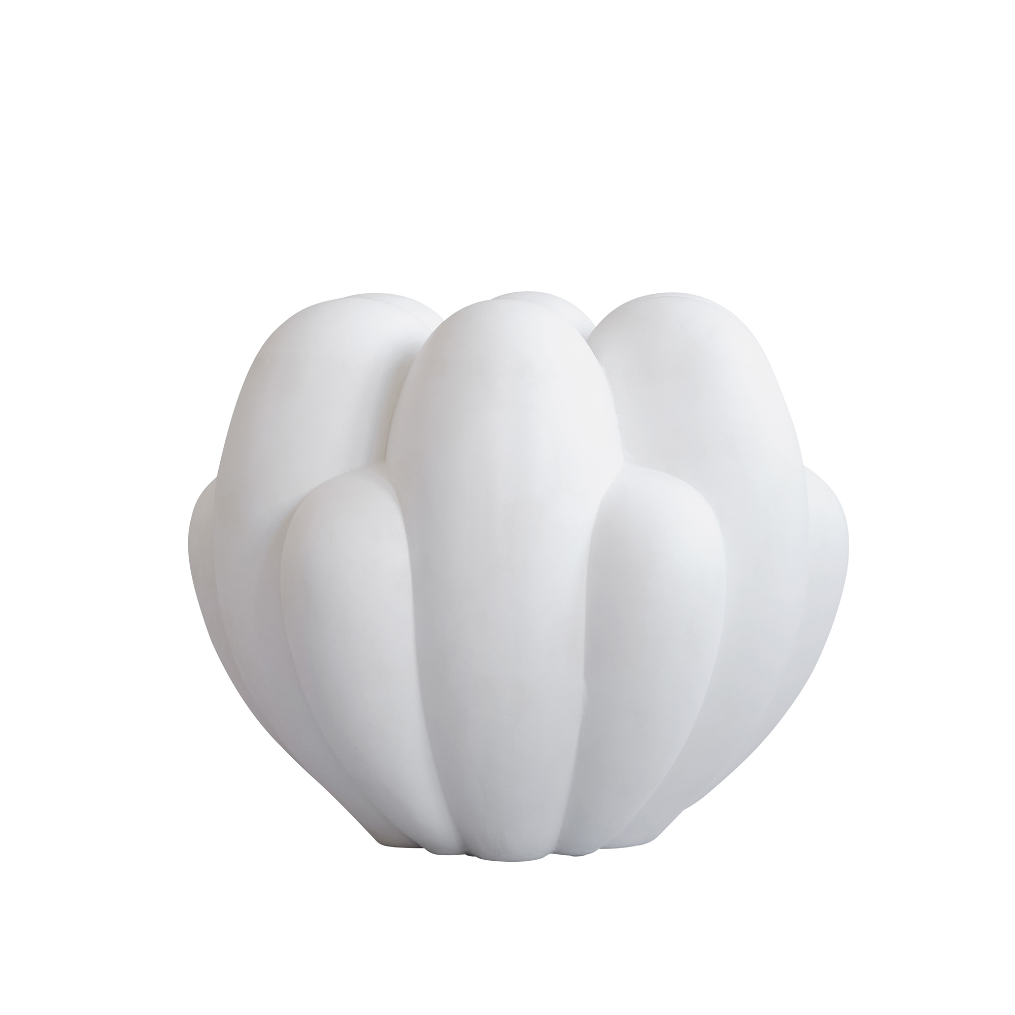 Bloom Vase Big från varumärket 101 Copenhagen, formgiven av Kristian Sofus Hansen & Tommy Hydahl. Med inspiration från 70-talets designelement har vasen fått sin unika form med rundade ytan och starka geometrier som ger ett distinkt utseende, samt möjliggör skapandet av skuggor och ljusspel längs sidorna. Vasen ger en känsla av modernism och elegans i rummet och kan användas som en dekorativ inredningsdetalj eller att placera vackra blommor i. Vasen är ej 100% vattentät, därför ingår en påse för färska blommor.