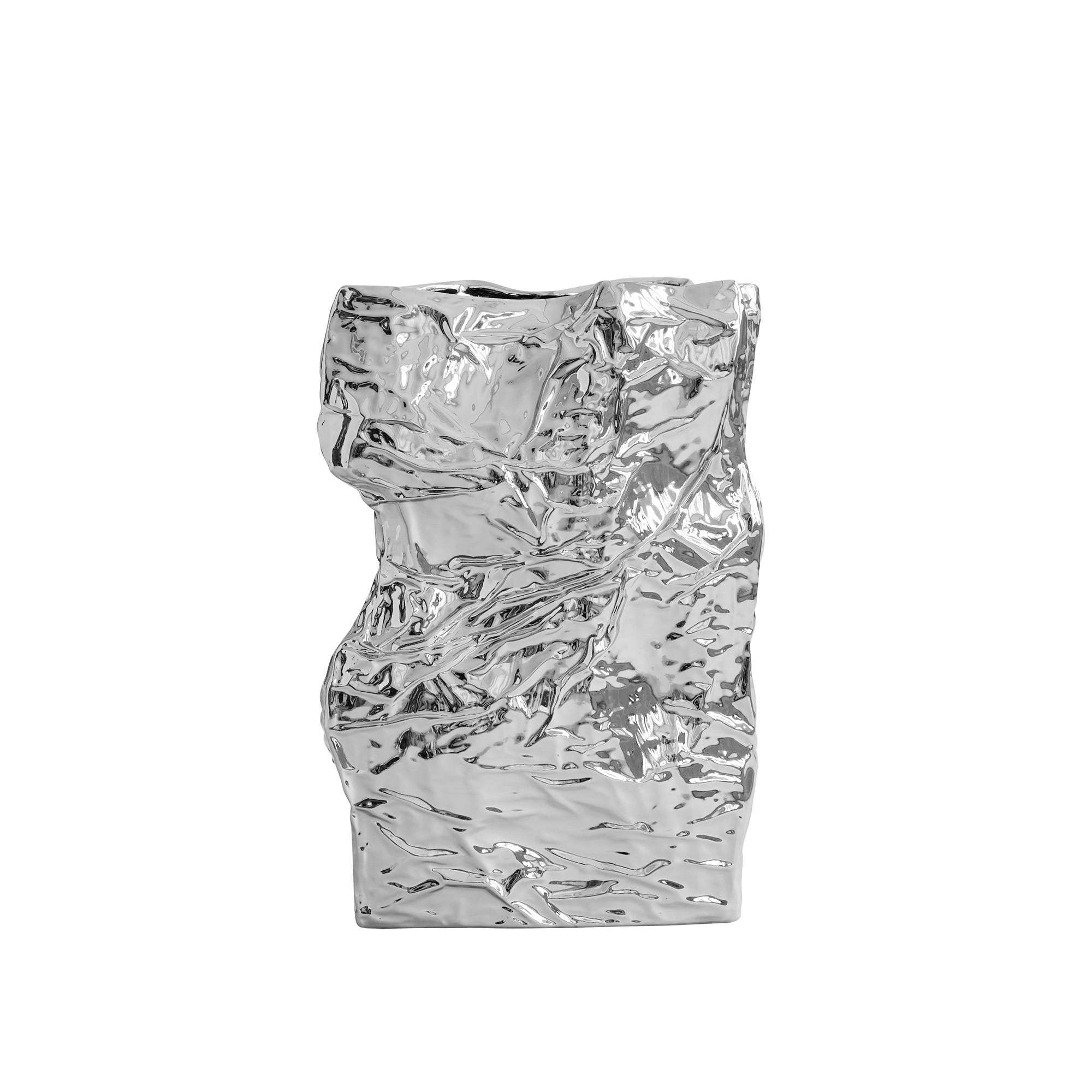 Kami Vase Chrome från 101 Copenhagen är en keramikvas designad av Kristian Sofus Hansen och Tommy Hyldahl. Vasen har en skulptural form inspirerad av skrynkliga papperspåsar, vilket återspeglas i dess yta med ojämna kurvor och kanter. Namnet ""Kami"" kommer från det japanska ordet för papper och är en hyllning till traditionell papperskonst. Varje vas är handglaserad, vilket gör varje exemplar unikt. Vasen är vattentät och har en glaserad insida som gör den lämplig för färska blommor.