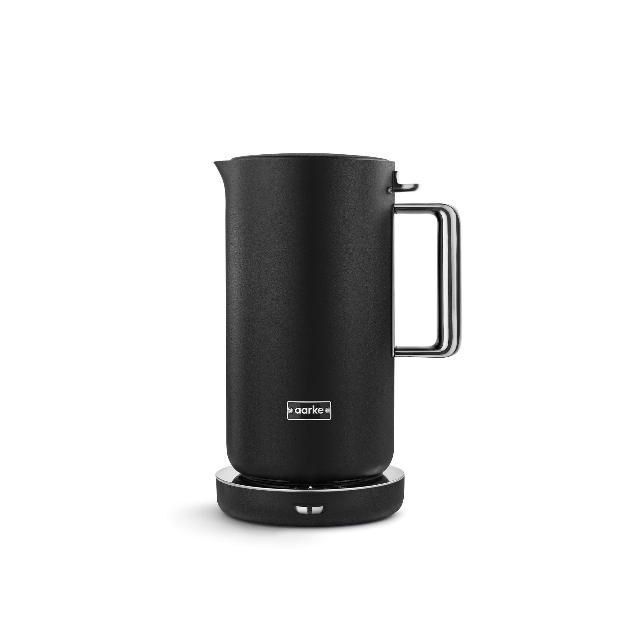 Kettle Matte Black från Aarke i rostfritt stål med en dubbelväggskonstruktion som minskar ljudnivån och håller vattnet varmt längre. Den rymmer 1,2 liter och har flera temperaturinställningar från 40°C till 100°C. Den breda öppningen och det avtagbara kalkfiltret underlättar rengöringen. Vattenkokaren har en rundad botten och en minimalistisk design som passar både på köksbänken och vid matbordet.