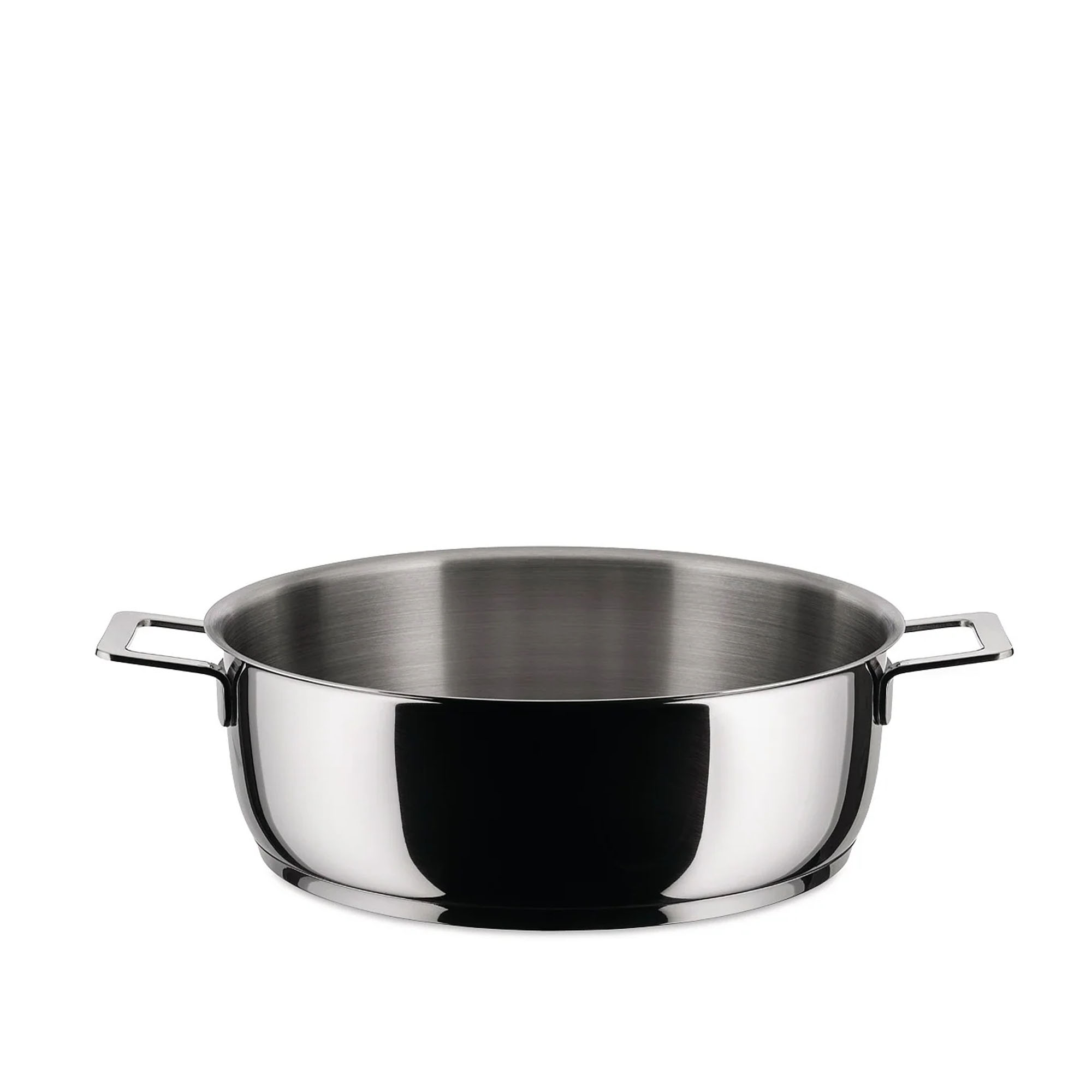 Pots & Pans Casserole Low för varumärket Alessi är designad av Jasper Morrison. Detta är en låg kastrull med två handtag och tillverkad i 18/10 rostfritt stål med en magnetisk stålbotten lämplig för induktionshällar. Med hjälp av grytan kan du tillaga såser, röror, grytor och andra krämiga rätter.