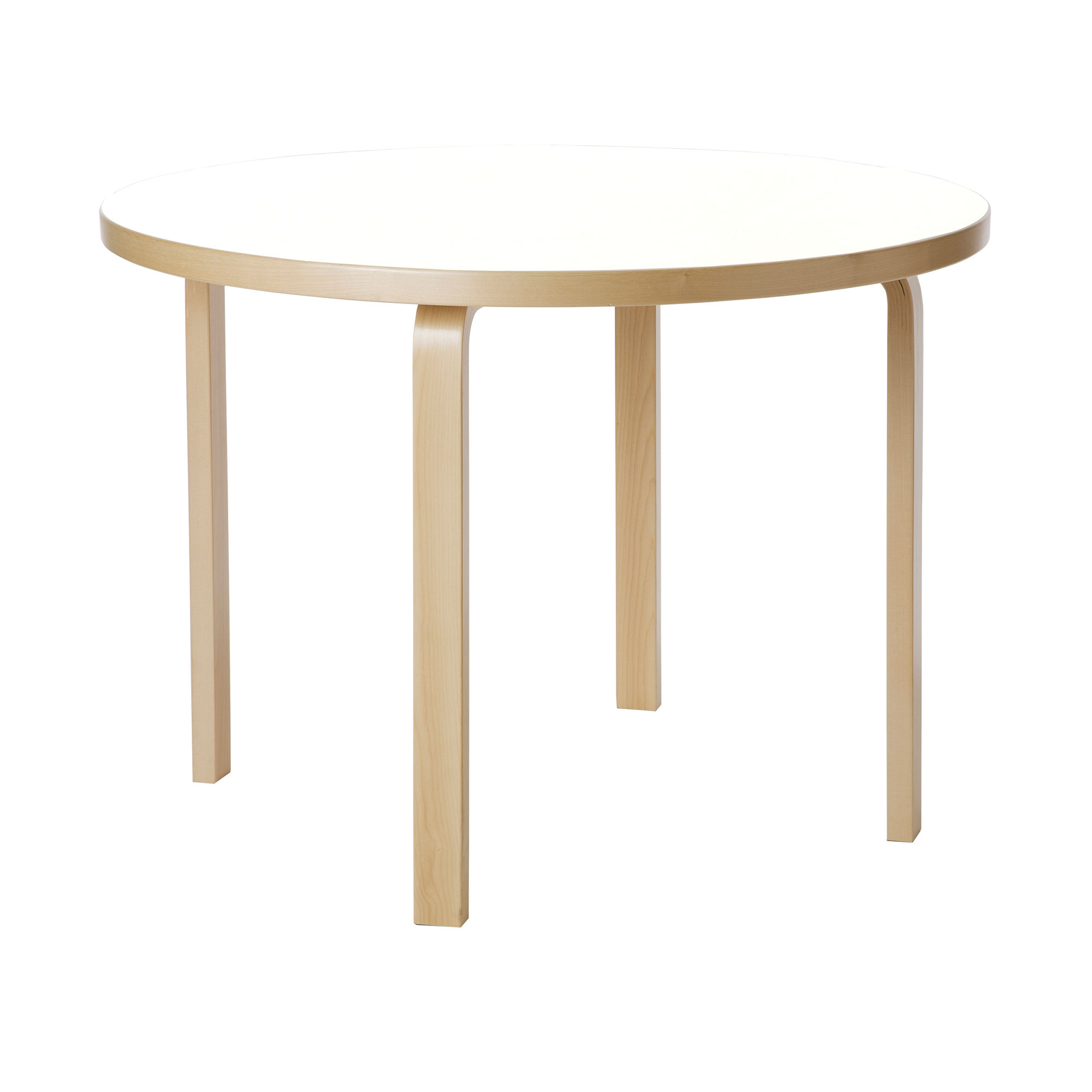 Bord 90A från Artek, formgivet av Alvar Aalto 1935. Ett nätt men ändå rymligt matbord med ben i formpressad björk och 4 cm tjock bordsskiva i tre olika utföranden – vit laminat, svart linoleum eller björkfanerad.