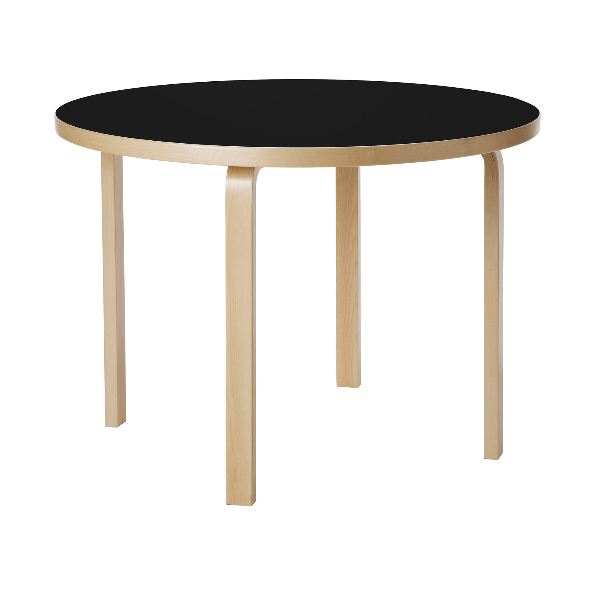 Bord 90A från Artek, formgivet av Alvar Aalto 1935. Ett nätt men ändå rymligt matbord med ben i formpressad björk och 4 cm tjock bordsskiva i tre olika utföranden – vit laminat, svart linoleum eller björkfanerad.