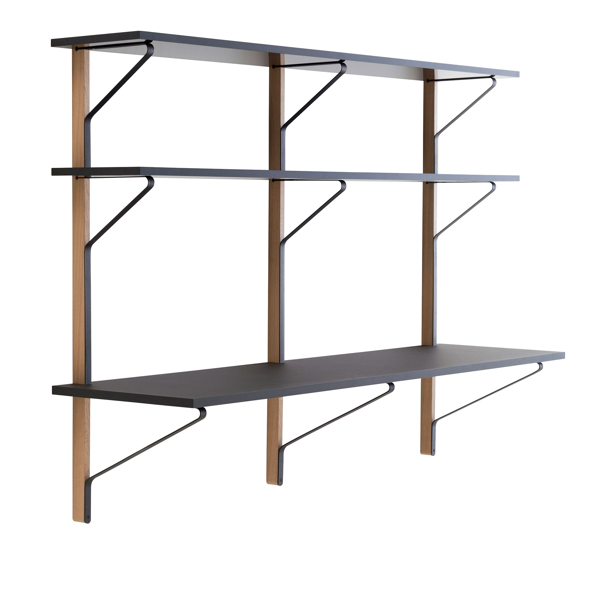 Kaari Shelf With Desk REB 010, vägghylla med skrivbord formgiven av Ronan & Erwan Bouroullec för Artek. I den eleganta kollektionen Kaari har bröderna Bouroullec kombinerat stilren design med enkel konstruktion. Kaari Shelf With Desk har två hyllplan och en skrivbordsskiva. Hyllplanen har en yta av melamin med svart glans medan skrivbordsskivan har en yta av svart linoleum. Väggfästena är tillverkade i massiv ek och har en skyddande lack. Konsolerna i svartlackerat stål ger diagonalt stöd åt hyllplanen. På liknande sätt som Alvar Aalto använde L-formade ben som stöd åt stolar, pallar och bord, har bröderna Bouroullec kombinerat massivt trä med stål för att skapa ett stabilt stöd åt bord och vägghyllor i kollektionen Kaari.