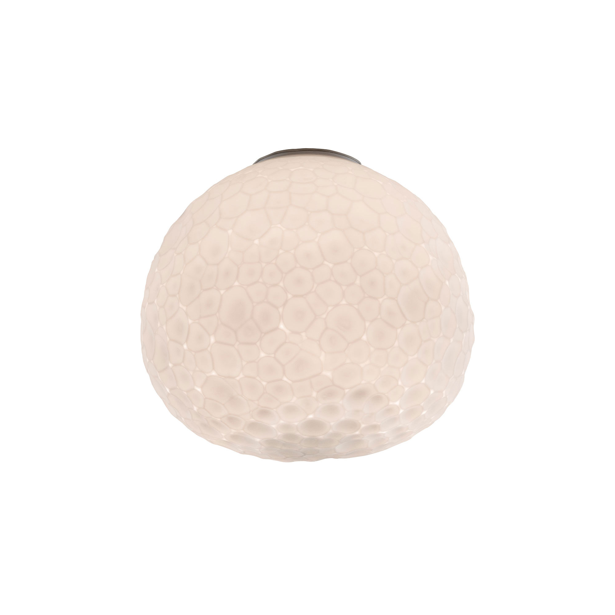 Meteorite-taklampan är en del av en kollektion som skapades av Pio & Tito Toso under 2015. Denna specifika modell är en större version av Meteorite-seriens tak- och vägglampor, men är exklusivt avsedd för takmontering. Den är framställd av teknopolymer och glasmaterial. Dess frostade glaskupa består av två lager blåst glas, format med en metod känd som ""stampo a fermo"". Denna teknik, kombinerad med en efterföljande slipningsprocess, bidrar till kupans texturerade och råa yta. Lampan sprider ett mjukt och jämnt ljus, vilket gör den idealisk för användning i både sovrum och hall. För att skapa en dynamisk ljusmiljö kan den med fördel kombineras med andra lampor i olika storlekar från samma serie. Observera att ljuskälla inte medföljer. Serien inkluderar även en hänglampa, en stående golvlampa och två olika bordslampor.