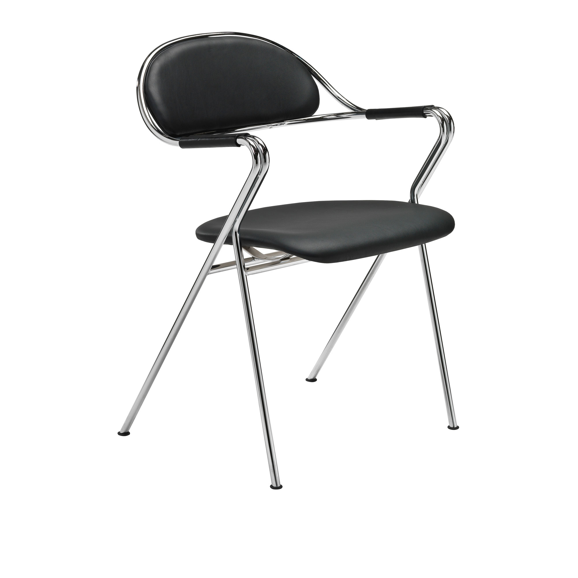 BM 65 är en karmstol från Bruno Mathsson International av förkromade stålrör. Sitsen och ryggbrickan är klädda med svart läder och har en stoppning av polyeter. Armstöden har formpressat plattläder. BM 65 formgavs av Bruno Mathsson 1965.