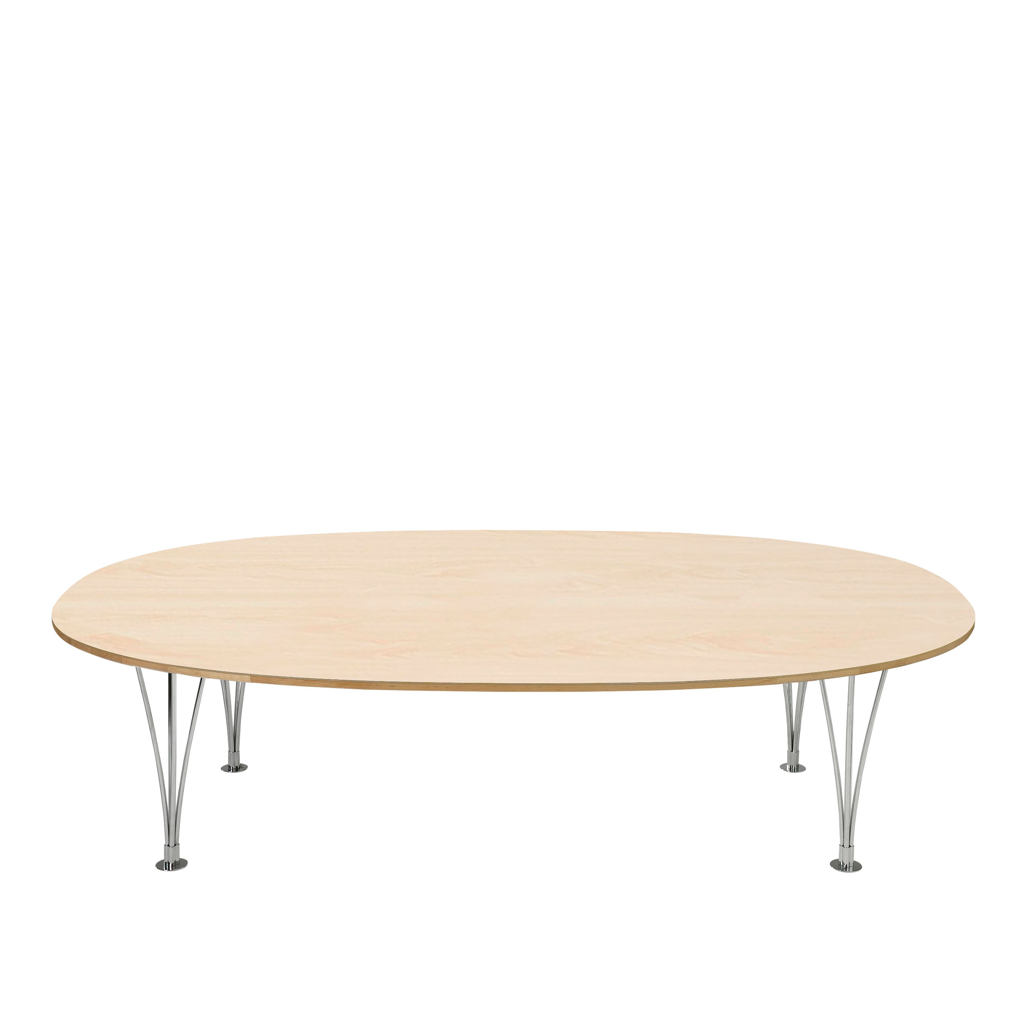 Designikonen Supercirkel, skapad av Bruno Mathsson tillsammans med Piet Hein 1965, är ett mångsidigt bord som erbjuds i olika höjder. Detta gör det tillgängligt både som ett soffbord och ett matbord. Supercirkel presenteras här som ett soffbord med alternativa höjder på 42, 52 eller 63 centimeter. Dessa varierande höjder tillåter bordet att komplettera både låga och höga soffor, vilket ger många möjligheter för användning. Det lägsta höjdet är idealiskt för låga sittgrupper, medan det högsta alternativet passar bättre bredvid soffor med högre sittkomfort. För ytterligare information om matbordsversionen, besök denna länk. Bruno Mathssons Supercirkel erbjuds också med bordsskivor i olika material såsom laminat, ek, ask, björk och bok. Dessa skivor finns i längder från 70 cm upp till 240 cm, med flera alternativ emellan. De största modellerna med skivlängder på 210 och 240 cm levereras med en delad skiva och ett extra, femte ben för att säkerställa stabilitet.