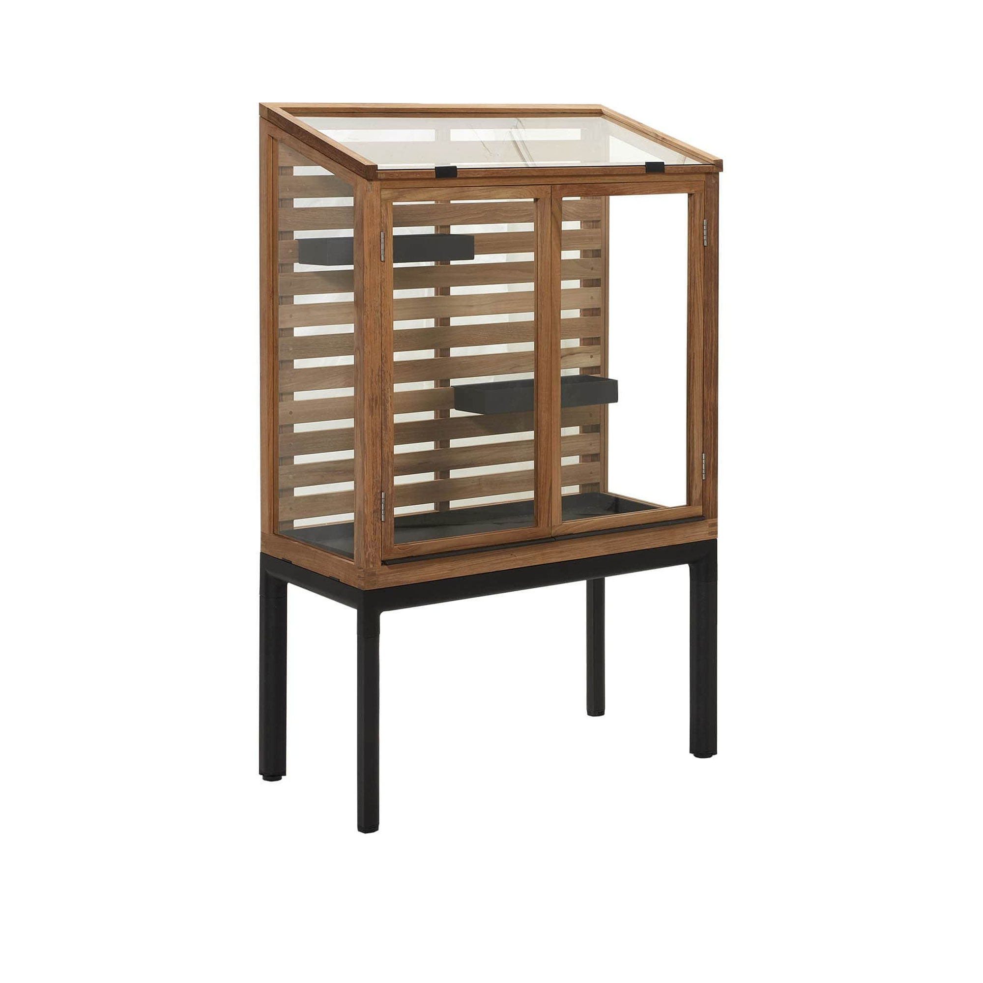 Drop Greenhouse är ett mindre växthus från danska Cane-line. Dess behändiga storlek och sofistikerade konstruktion gör det enkelt att flytta de två medföljande hyllplanen, som fästs på den ribbade baksidan, för smidig använding. Takluckan kan öppnas och ställas på glänt för att skapa cirkulation inuti växthuset och skapa optimala förhållanden för odling av exempelvis örter eller grönsaker. Tillverkad av naturligt oljerik teak som klarar av vädrets påfrestningar, rutor i glas och underrede i pulverlackerad stål.