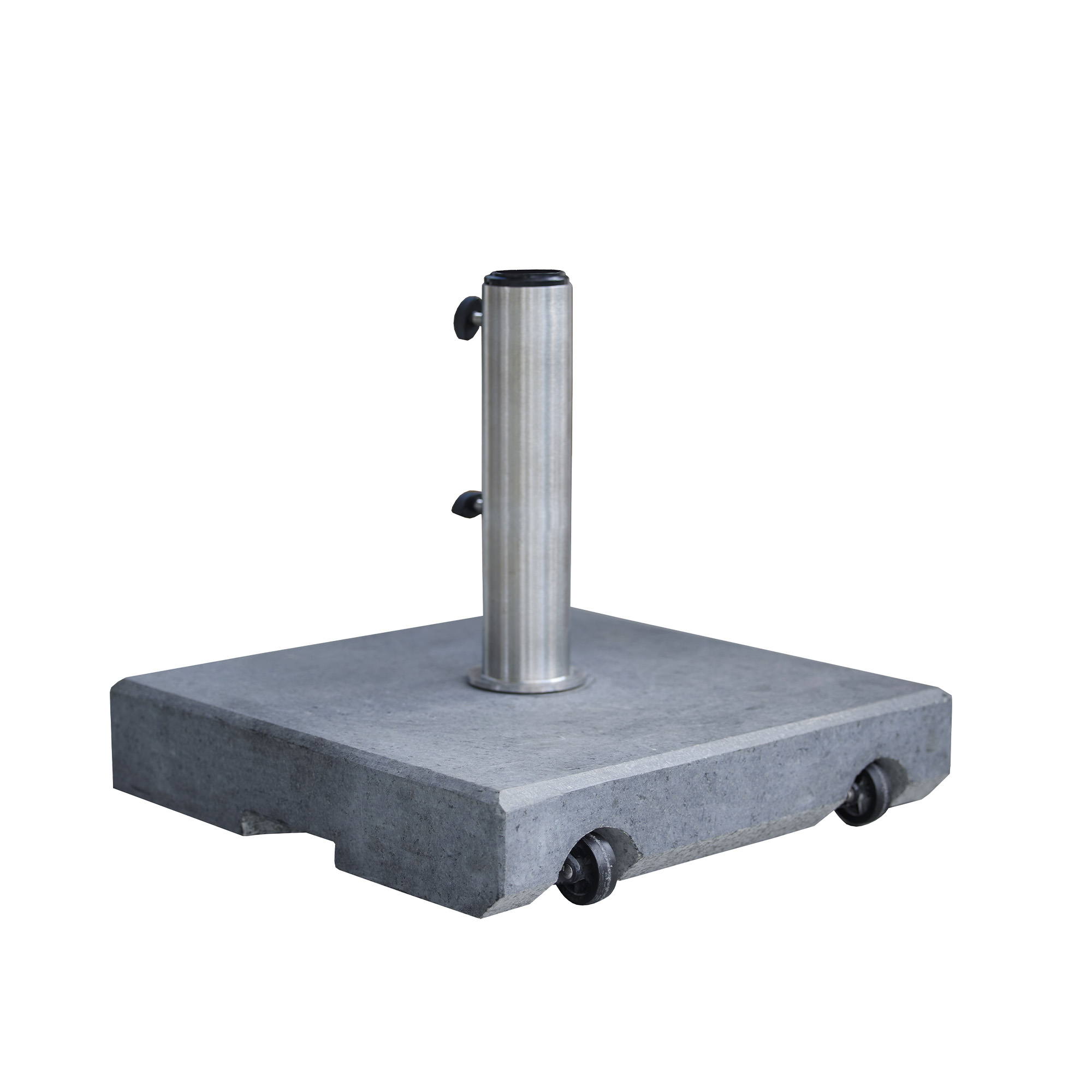 Denna parasollfot med hjul är ett tillbehör för utomhusbruk. Den är tillverkad i granit och har en design som passar olika uterum. Foten väger 50 kg och är kompatibel med parasoller som har en diameter på 21, 38, 48 och 54 mm. Hjulens konstruktion gör det enkelt att flytta parasollet vid behov.
