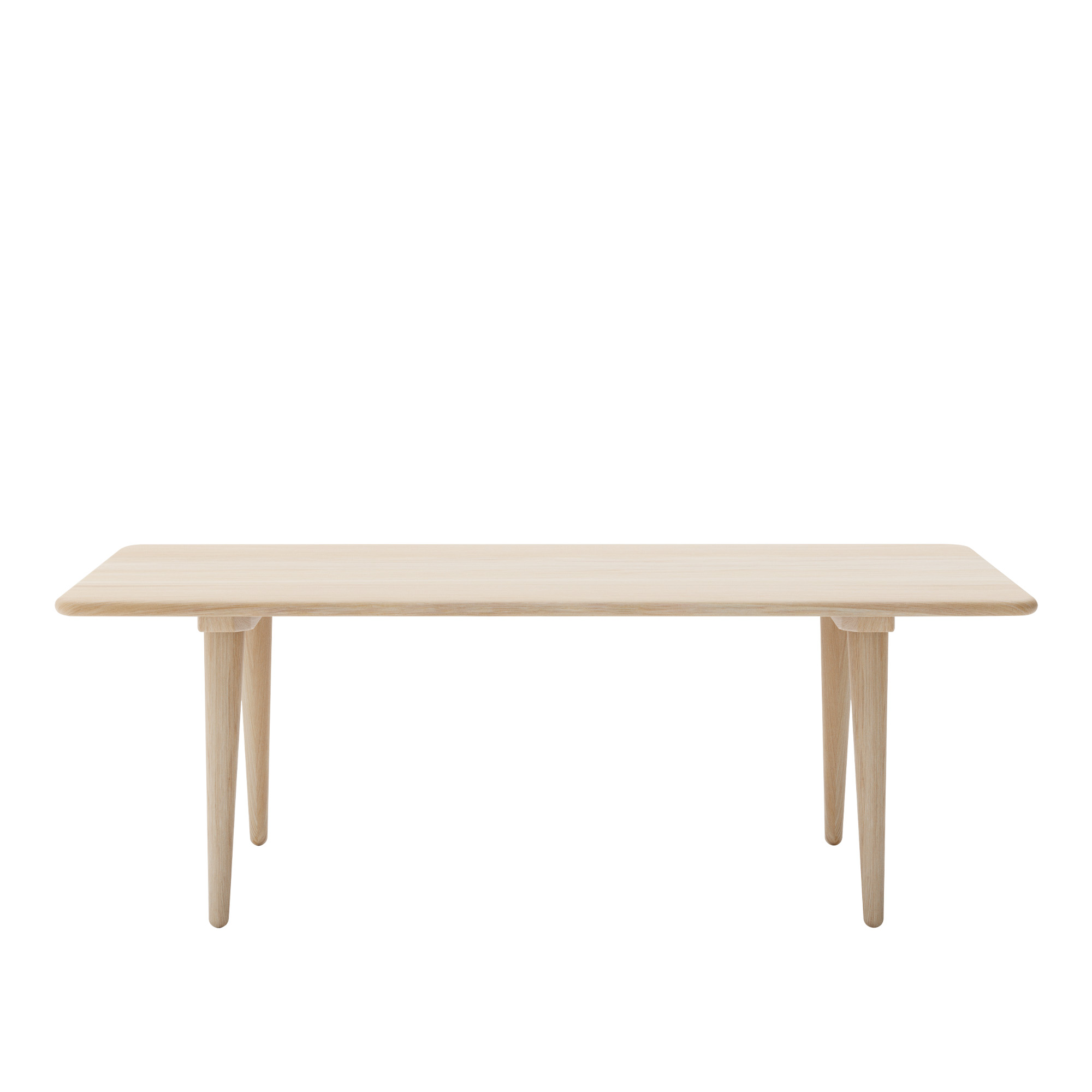 Soffbordet CH011 är en klassisk möbeldesign av Hans J. Wegner, framtagen för det danska företaget Carl Hansen & Søn under 1954. Detta bord har en rektangulär yta och delar designelement med det samtida runda bordet CH008, som också skapades det året. Wegner implementerade avsmalnande ben i massivt trä som elegant böjer sig utåt, vilket bidrar till ett sofistikerat och luftigt intryck. Bordet erbjuds i olika höjder, nämligen 44, 48 eller 53 centimeter. CH011 soffbordet finns i flera ytbehandlingar: klarlackad, oljad, tvålad, svartlackad eller vitoljad ek, alla tillverkade av massivt material.