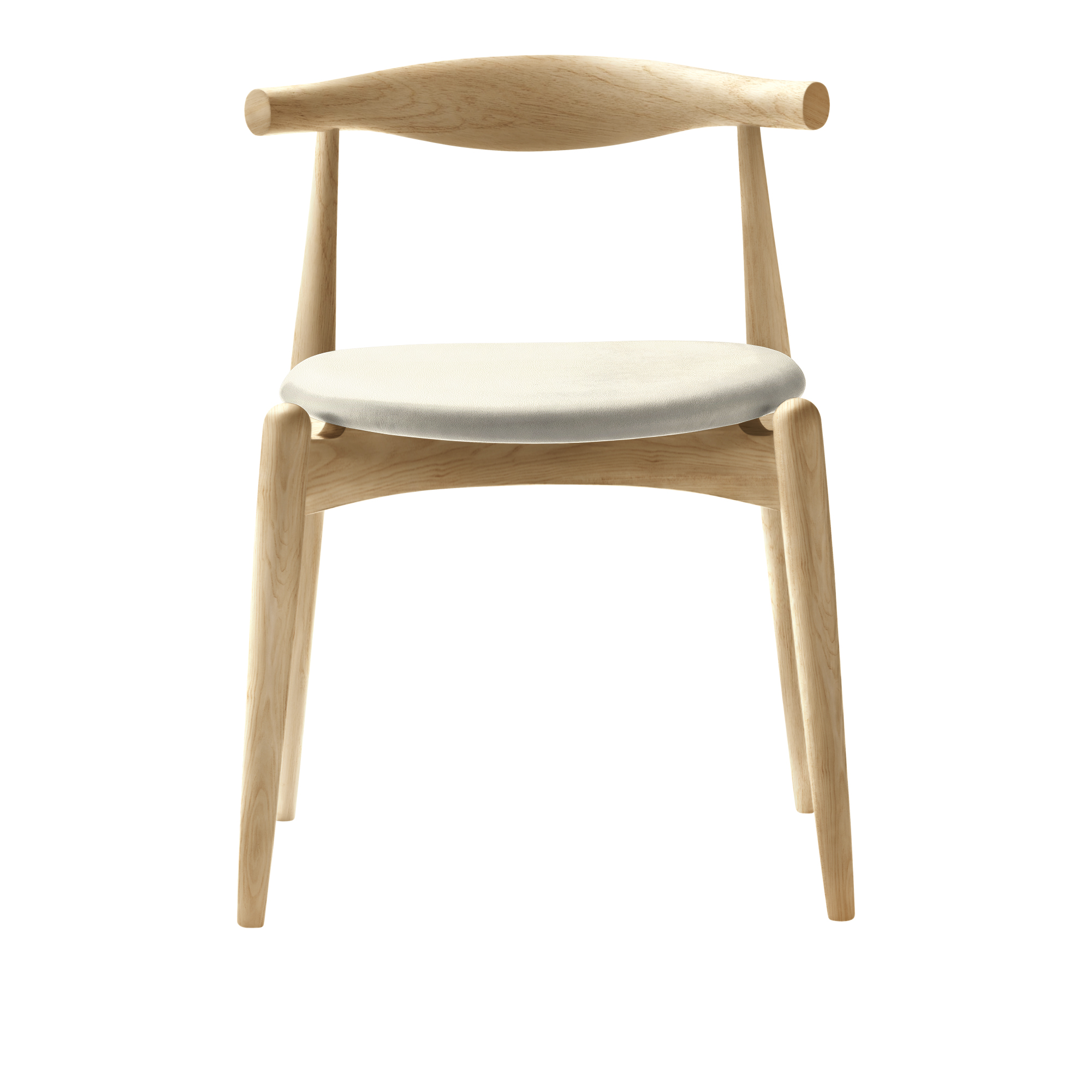 CH20 Elbow Chair från Carl Hansen & Son är designad av Hans J. Wegner år 1956, men lanserades för första gången år 2005.En kompakt, stapelbar matstol som även kan användas, tack vare att ryggstödet är bra anpassat för den nedre delen av ryggen som arbetsstol vid ett bord eller skrivbord. Den unika sitsen är tillverkad i 11-lagers laminerat trä och ger exceptionell stabilitet.Ramen finns i bok, ask och ek i olika utföranden som tvål, olja, lack, bets, färg och sitsen i ett stort utbud av tyger och läder.