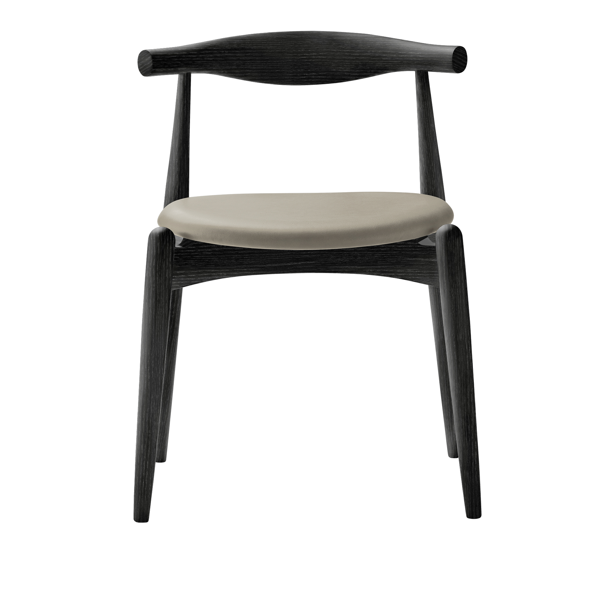 CH20 Elbow Chair från Carl Hansen & Son är designad av Hans J. Wegner år 1956, men lanserades för första gången år 2005.En kompakt, stapelbar matstol som även kan användas, tack vare att ryggstödet är bra anpassat för den nedre delen av ryggen som arbetsstol vid ett bord eller skrivbord. Den unika sitsen är tillverkad i 11-lagers laminerat trä och ger exceptionell stabilitet.Ramen finns i bok, ask och ek i olika utföranden som tvål, olja, lack, bets, färg och sitsen i ett stort utbud av tyger och läder.