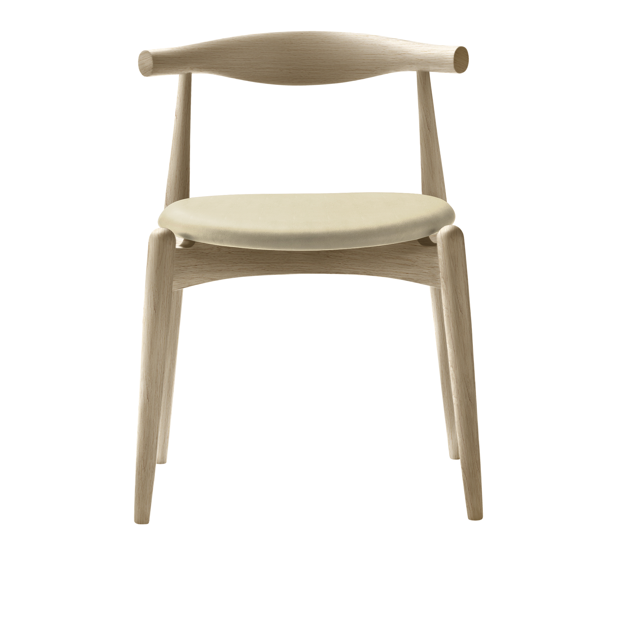 CH20 Elbow Chair från Carl Hansen & Son är designad av Hans J. Wegner år 1956, men lanserades för första gången år 2005.En kompakt, stapelbar matstol som även kan användas, tack vare att ryggstödet är bra anpassat för den nedre delen av ryggen som arbetsstol vid ett bord eller skrivbord. Den unika sitsen är tillverkad i 11-lagers laminerat trä och ger exceptionell stabilitet.Ramen finns i bok, ask och ek i olika utföranden som tvål, olja, lack, bets, färg och sitsen i ett stort utbud av tyger och läder.