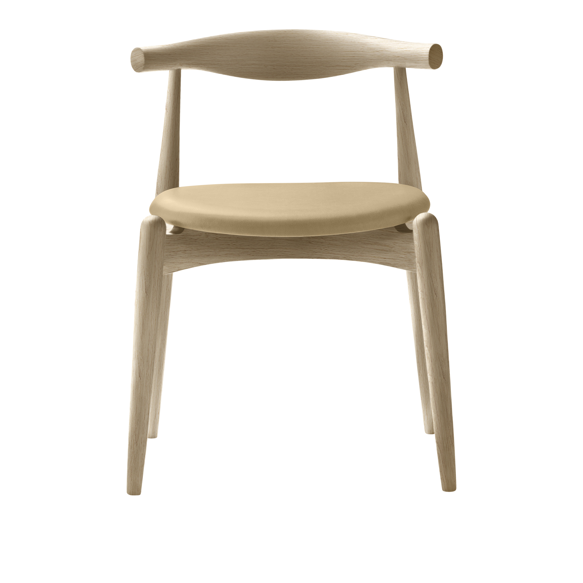 CH20 Elbow Chair från Carl Hansen & Son är designad av Hans J. Wegner år 1956, men lanserades för första gången år 2005.En kompakt, stapelbar matstol som även kan användas, tack vare att ryggstödet är bra anpassat för den nedre delen av ryggen som arbetsstol vid ett bord eller skrivbord. Den unika sitsen är tillverkad i 11-lagers laminerat trä och ger exceptionell stabilitet.Ramen finns i bok, ask och ek i olika utföranden som tvål, olja, lack, bets, färg och sitsen i ett stort utbud av tyger och läder.