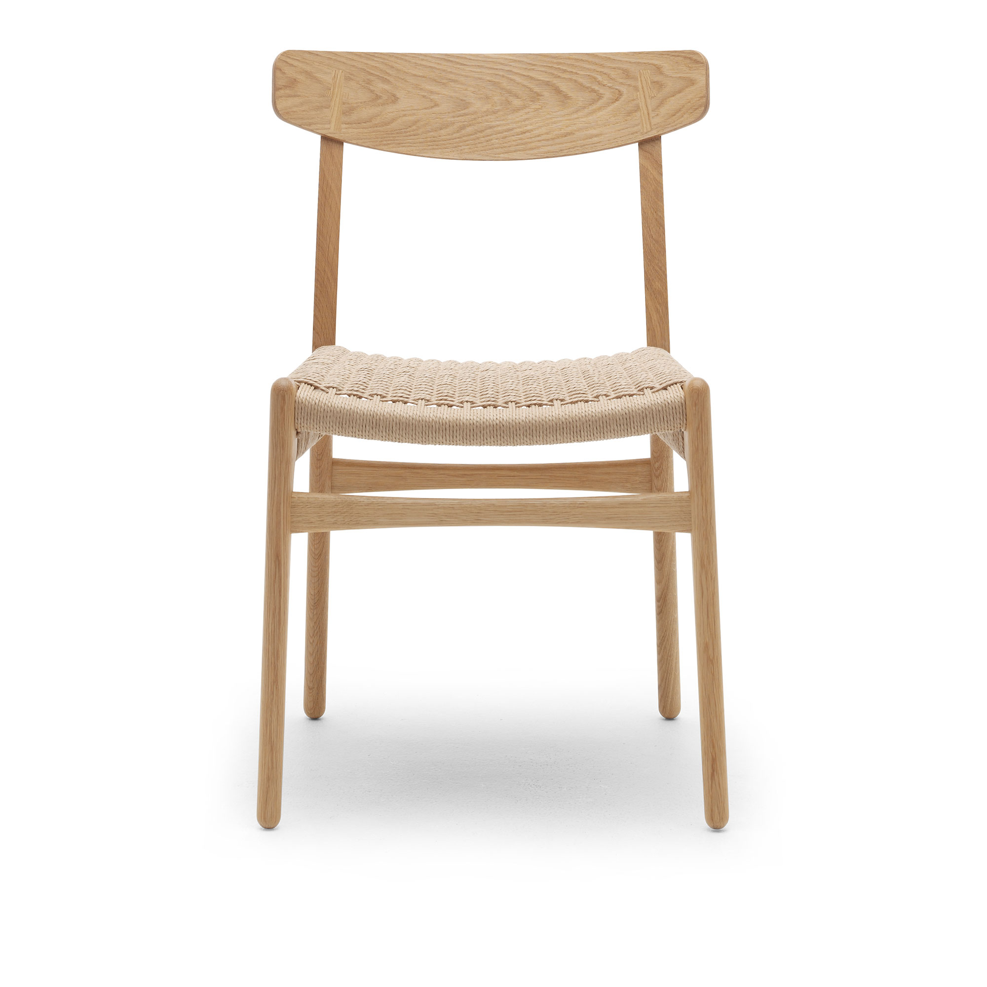 CH23 har ett flertal välkända Wegner-detaljer såsom formen på de eleganta trädetaljerna i ryggstödet, den särskilda dubbelvävda sitsen och den välvda formen på de bakre benen för att säkerställa optimal stabilitet. Stolen kan vid första anblicken tyckas okomplicerad, men vid en närmare titt framträder många fina detaljer. Wegners utsökt förfinade träarbete syns bland annat i de korsformade detaljerna, som han använde för att markera mötet mellan det formpressade ryggstödet i fanér och stolens stomme.