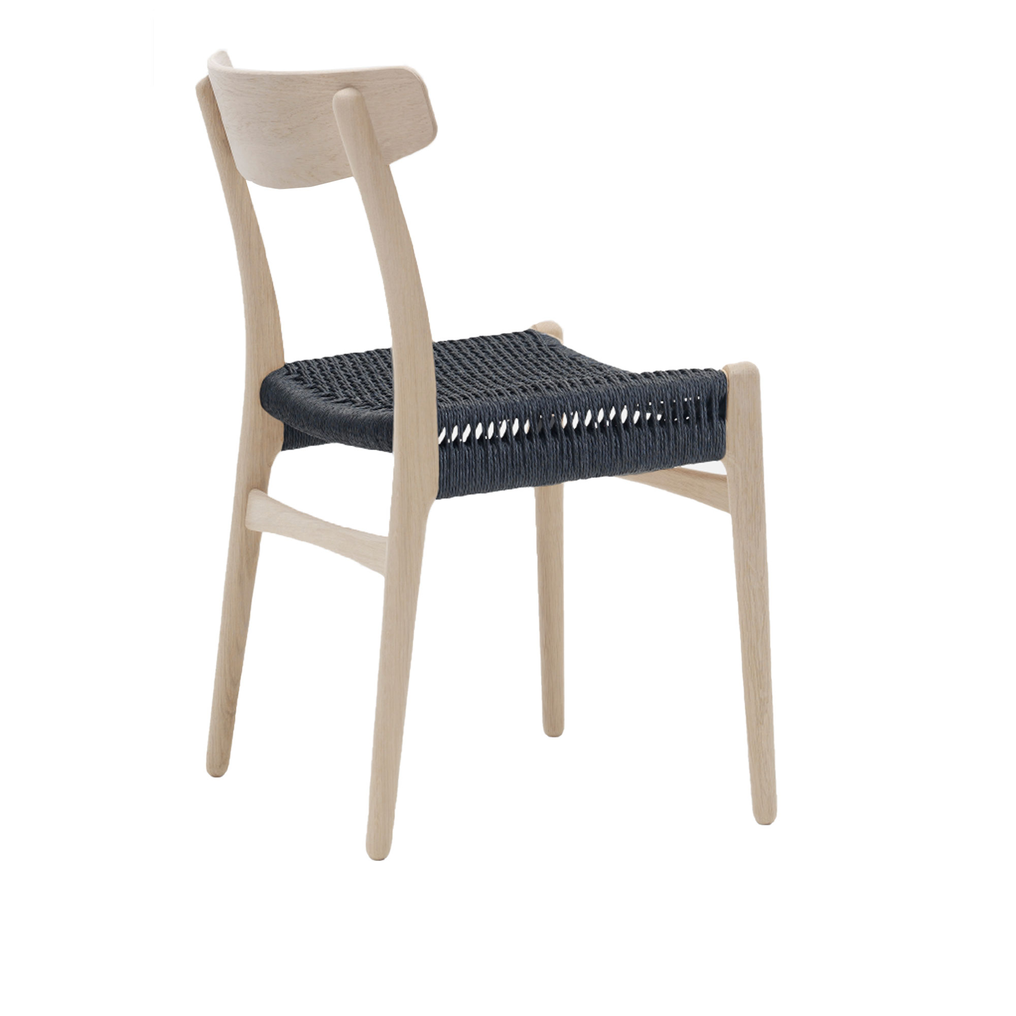 Gå djupare in i CH23:s förtrollande konstruktion. Denna version är tillverkad av massiv ek och betonar därmed hållbarhet och en förankring i naturen. Sätet, noggrant flätat med svart papperssnöre, erbjuder inte bara komfort utan tillför även en taktil dimension till stolen. Samspelen mellan ek och papperssnöre representerar en harmonisk fusion av traditionellt hantverk och modern design och gör CH23 till en sann manifestation av Carl Hansen & Søns arv.