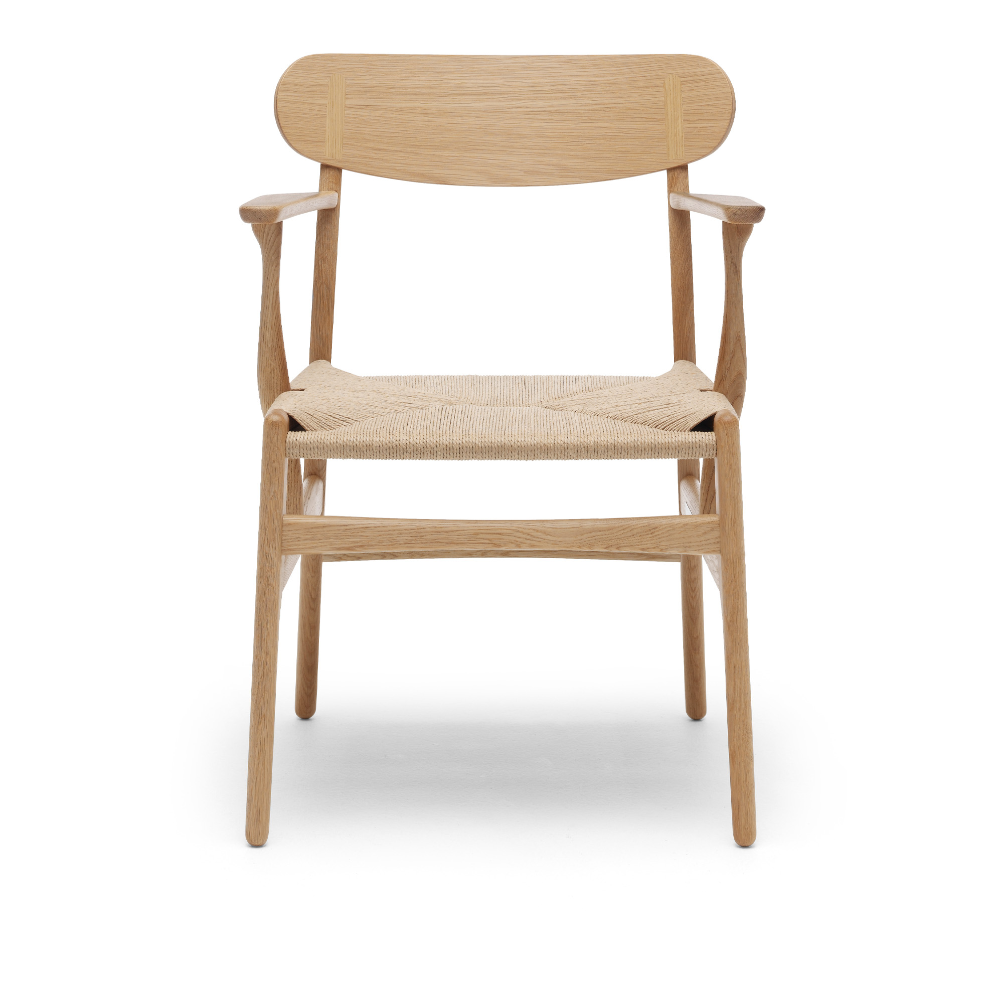 Stolen CH26 från varumärket Carl Hansen & Søn formgavs av Hans J. Wegner i början på 1950-talet, men sattes först i produktion år 2016. CH26 visas här i massiv ek med en naturligt färgad sits av kuvertflätat papperssnöre. Hos oss finns det även möjlighet att välja stolen i valnöt eller med svart sits. Som alltid med Wegners möbler ligger det ett skickligt och tidskrävande hantverk bakom, vilket den handflätade sitsen och de smäckra detaljerna vittnar om.