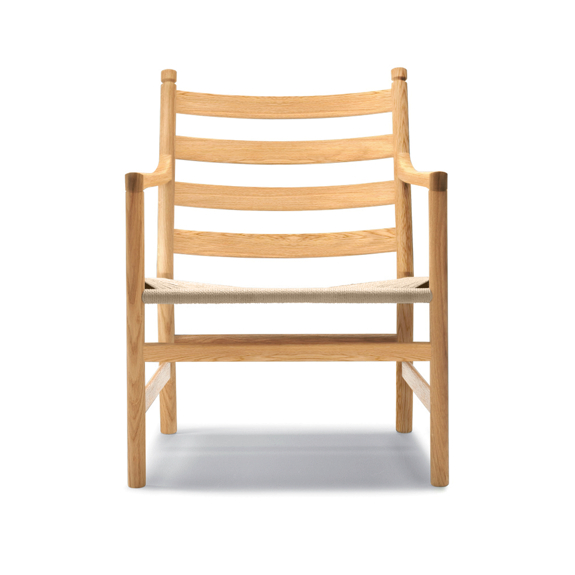 1965 designade Hans J. Wegner fåtölj CH44 för Carl Hansen & Son. En smidig men ändå väldigt bekväm fåtölj som gör sig bra där en mer traditionell, klumpigare fåtölj skulle te sig allt för dominant. Tillverkad i massiv ek med sits av vaxat papperssnöre (natur eller svart).