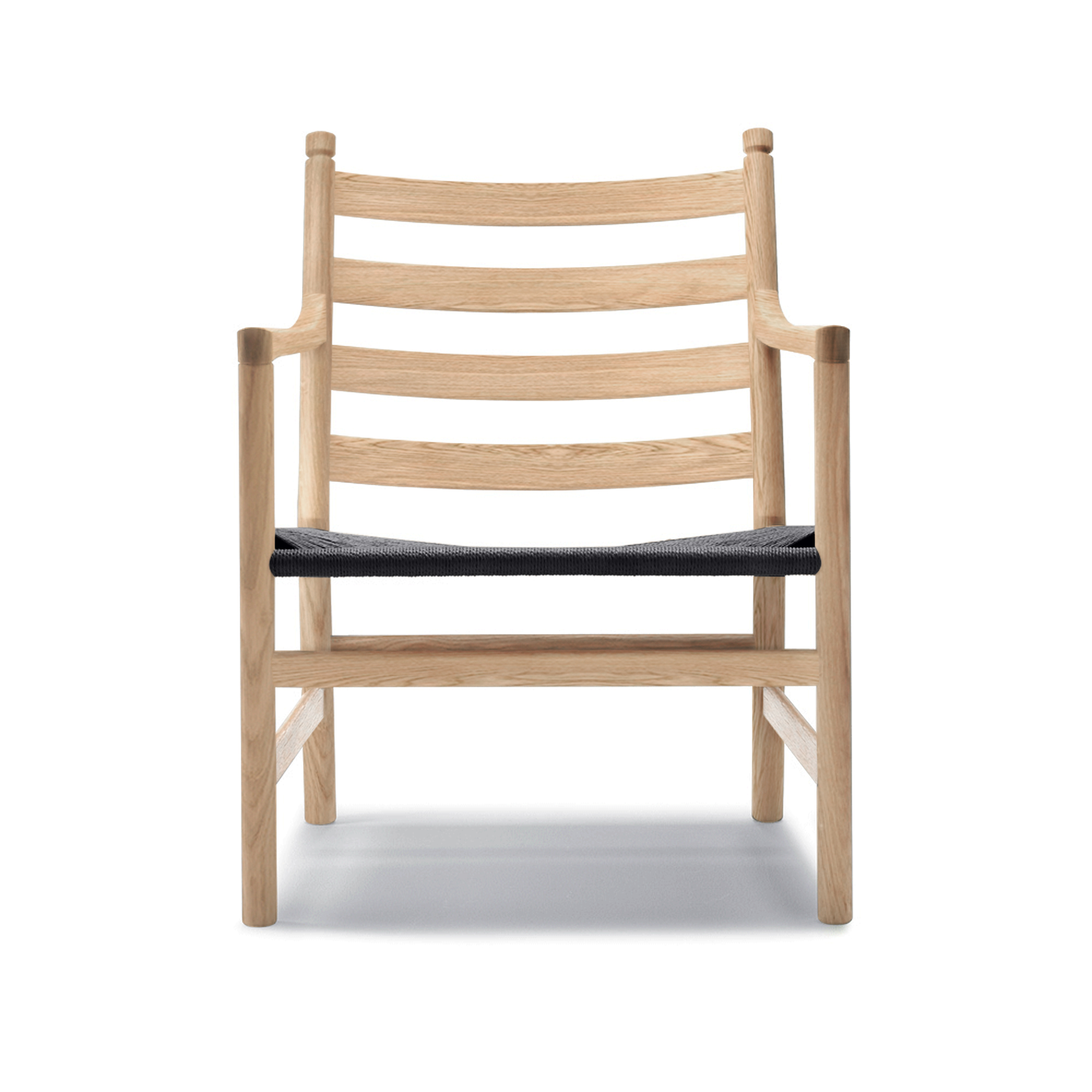 1965 designade Hans J. Wegner fåtölj CH44 för Carl Hansen & Son. En smidig men ändå väldigt bekväm fåtölj som gör sig bra där en mer traditionell, klumpigare fåtölj skulle te sig allt för dominant. Tillverkad i massiv ek med sits av vaxat papperssnöre (natur eller svart).