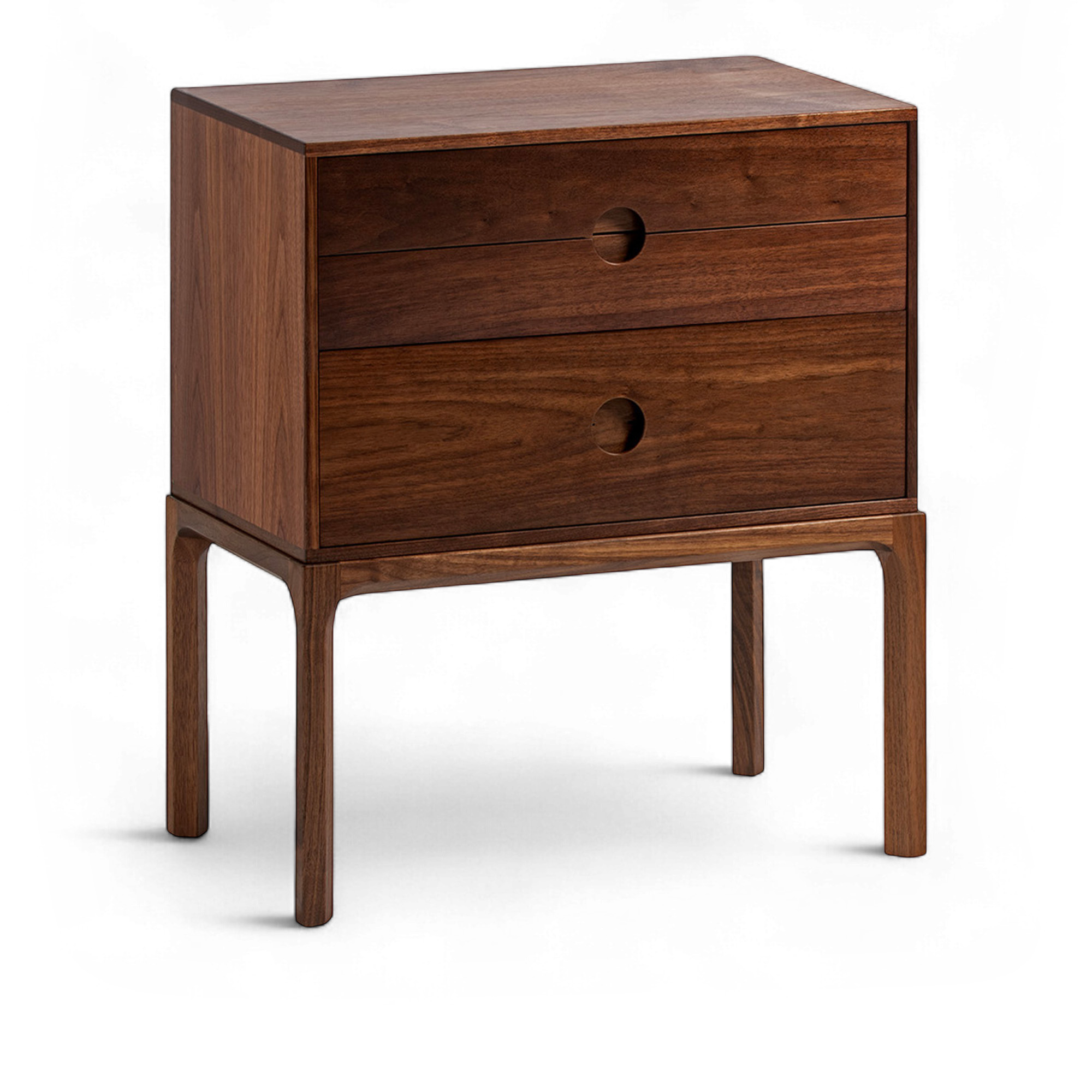 Entre Tall Bedside är ett sängbord från varumärket Dagmar. Formgivet av Kai Kristiansen och som en del av Entre-serien, kännetecknas bordet av fasade ben och halvmåneformade lådhandtag – två återkommande element i formgivarens formspråk. Bordet tillverkas i Danmark med traditionella snickerimetoder och kommer i massivt ek eller valnöt med oljad ytbehandling. Med en höjd på 70 cm och två lådor erbjuder nattduksbordet praktisk förvaring vid sängen eller i andra rum. Sängbordet kan användas fristående eller i par, exempelvis vid en dubbelsäng.