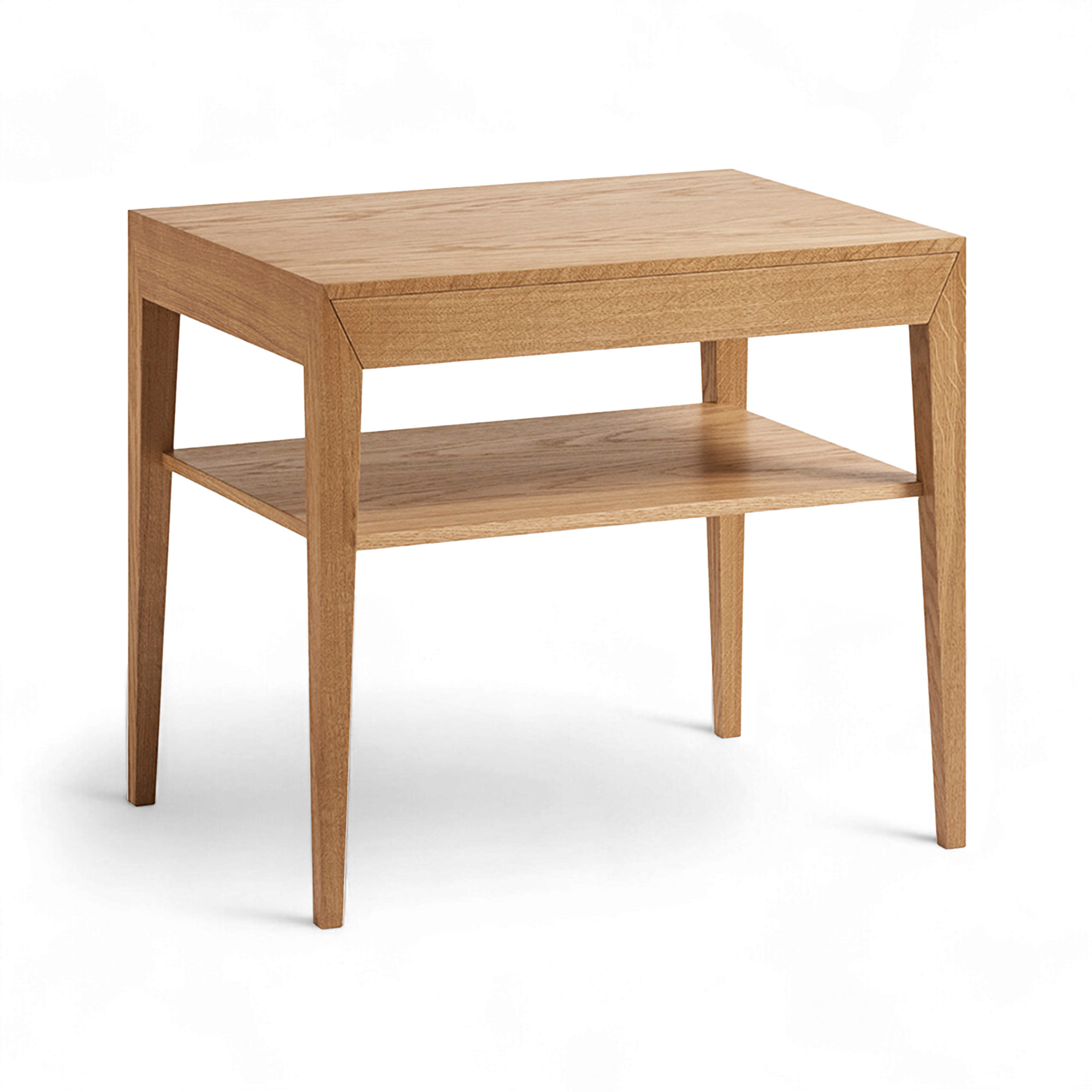 Margrethe/Model 35 Bedside Table från Dagmar, designad av formgivaren Severin Hansen, är ett sängbord som utmärks av ett precist och raffinerat hantverk. Bordets formspråk kännetecknas av Hansens karakteristiska trefogade hörn och elegant avsmalnande ben, detaljer som speglar den danska designtraditionens noggrannhet och balans. Tillverkat i massiv ek eller valnöt med oljad yta, utstrålar bordet naturlig värme och tidlös kvalitet. Bordet kan fås med eller utan hylla i rotting eller trä, vilket ger flexibilitet i både uttryck och funktion. Denna variant levereras med en hylla i matchande trä, vilket framhäver bordets enhetliga och harmoniska design. Bordet ingår i serien Margrethe.