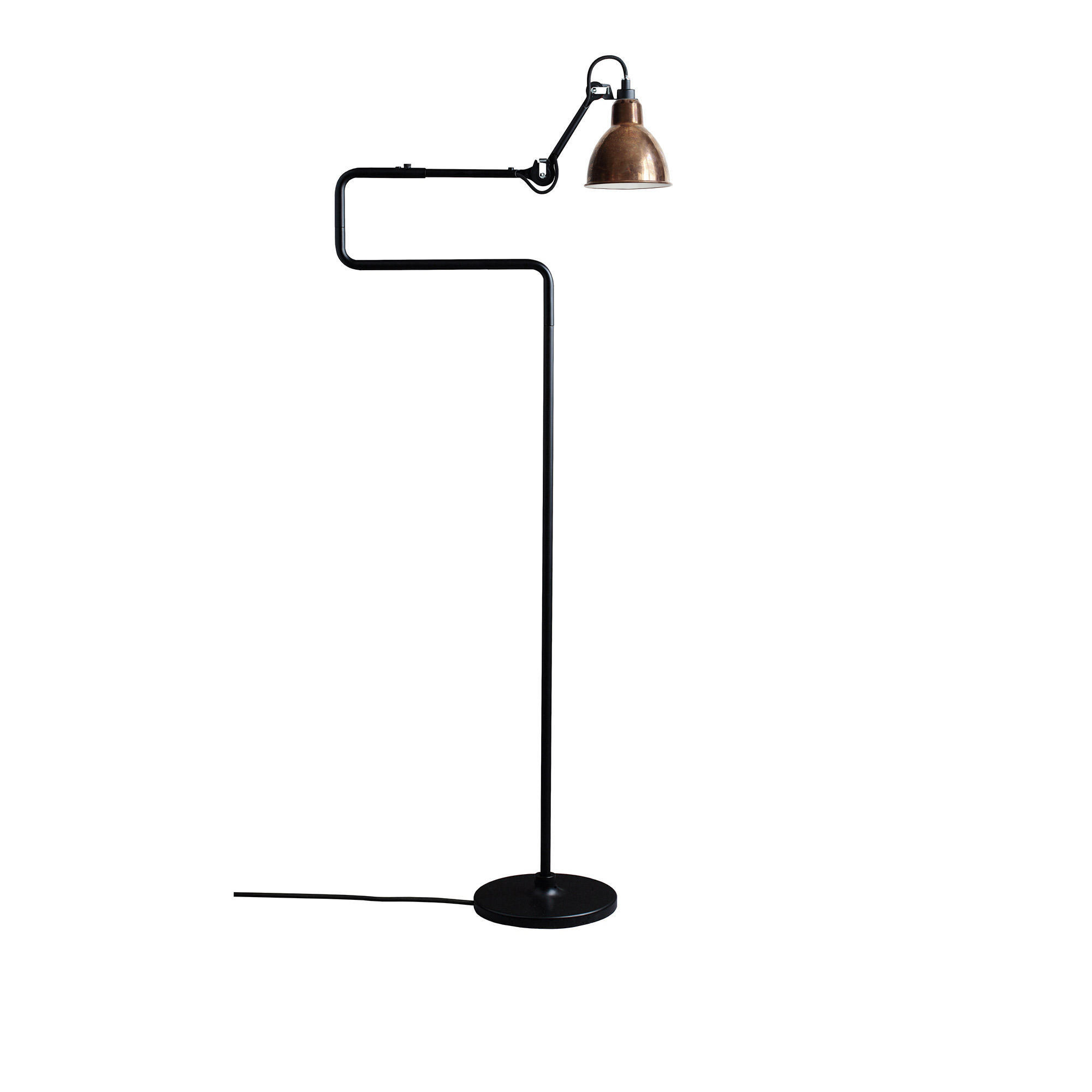 Golvlampan No411 är en förfinad version av den klassiska Lampe Gras, skapad av Bernard-Albin Gras år 1921. Dess justerbara stålarm tillför inte enbart en distinkt estetik till lampan, utan erbjuder också en funktionell fördel genom att den kan förlängas till dubbel längd. Detta är särskilt fördelaktigt i en läshörna där lampan enkelt kan justeras bort när den inte tjänar som läsljus. Lampe Gras-serien inkluderar även modeller för bord, tak och vägg.Det är viktigt att notera att koppar är ett levande material och att modellen i obehandlad koppar levereras utan ytterligare finish. Eftersom den är obehandlad kommer en naturlig patinering att ske med tiden, vilket varierar beroende på var produkten placeras. Den obehandlade kopparns utseende förändras gradvis och får en mer enhetlig patina efterhand.