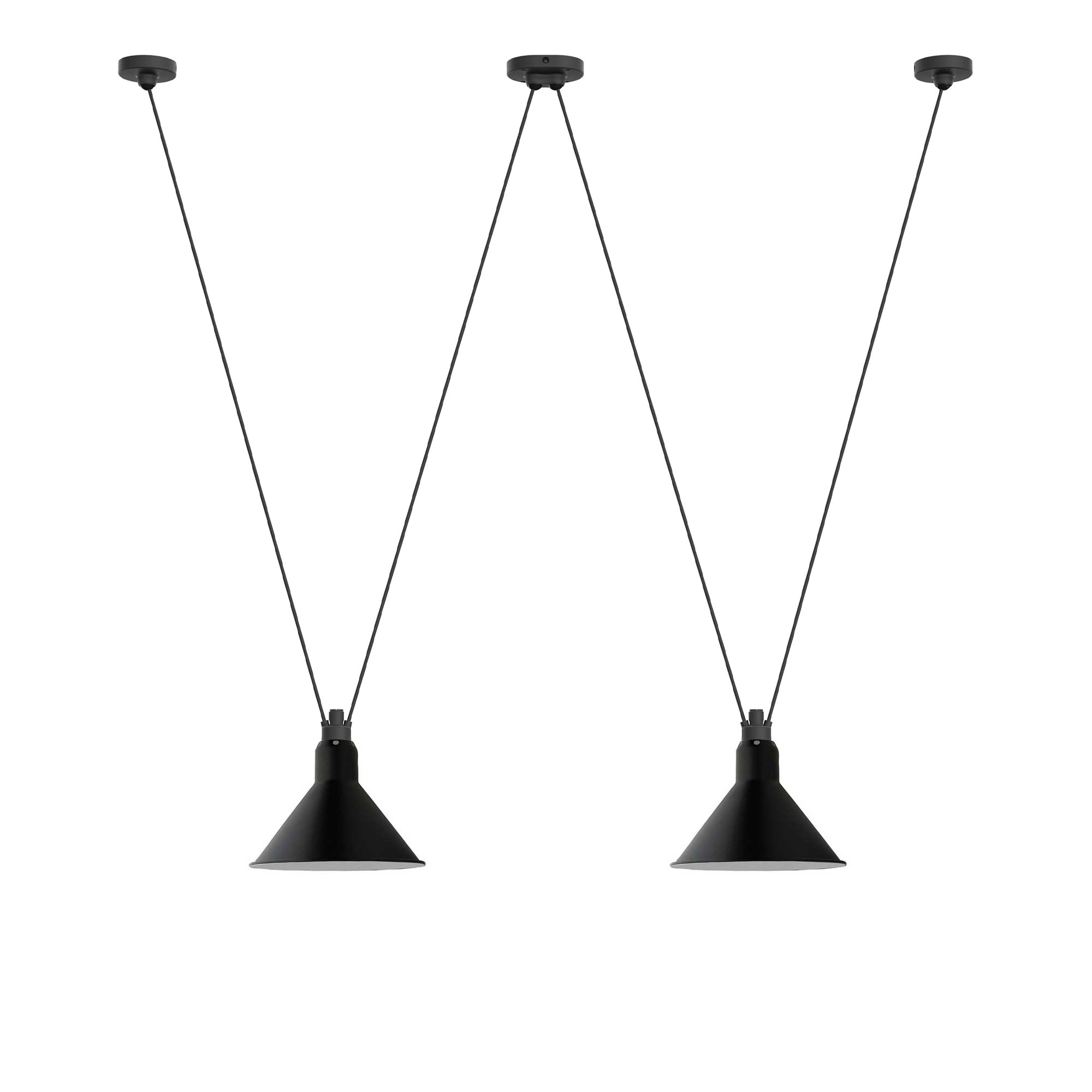 Les Acrobates de Gras No 324 - Conic L är en taklampa med en design som innefattar två konformade skärmar, upphängda med hjälp av fyra diagonala textilsladdar som bidrar till ett livfullt uttryck. Bernard-Albin Gras är skaparen bakom denna lampa, och den introducerades av DCWéditions under 2015. De justerbara textilsladdarna tillåter variation i höjd och kommer med individuella samt ett delat takfäste i en mattsvart aluminiumfinish. Observera att ingen ljuskälla medföljer. Denna modell är idealisk för såväl enskild placering som i grupp med liknande lampor eller tillsammans med andra lampor från samma kollektion. Den är perfekt att placera över ett köksbord eller som ett lekfullt inslag i ett barnrum, inspirerad av cirkusakrobaters luftakrobatik.