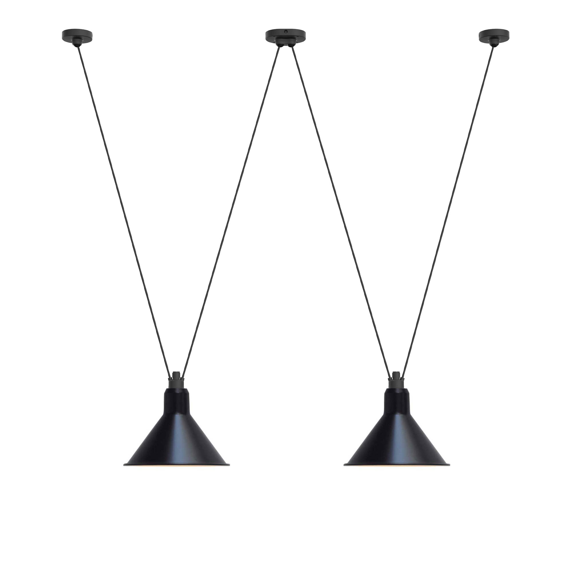 Les Acrobates de Gras No 324 - Conic XL är en pendellampa med två konformade skärmar, upphängda i fyra diagonala textilkablar för en dynamisk effekt. Formgiven av Bernard-Albin Gras och lanserad 2015 av DCW éditions. Textilkablarna är höjdjusterbara och monteras med enskilda och gemensamma takfästen i mattsvart aluminium. Ljuskälla medföljer ej. Användbar enskilt, i grupp eller tillsammans med andra modeller från samma serie. Passar över matbord eller i lekfulla miljöer, inspirerad av cirkusakrobater.
