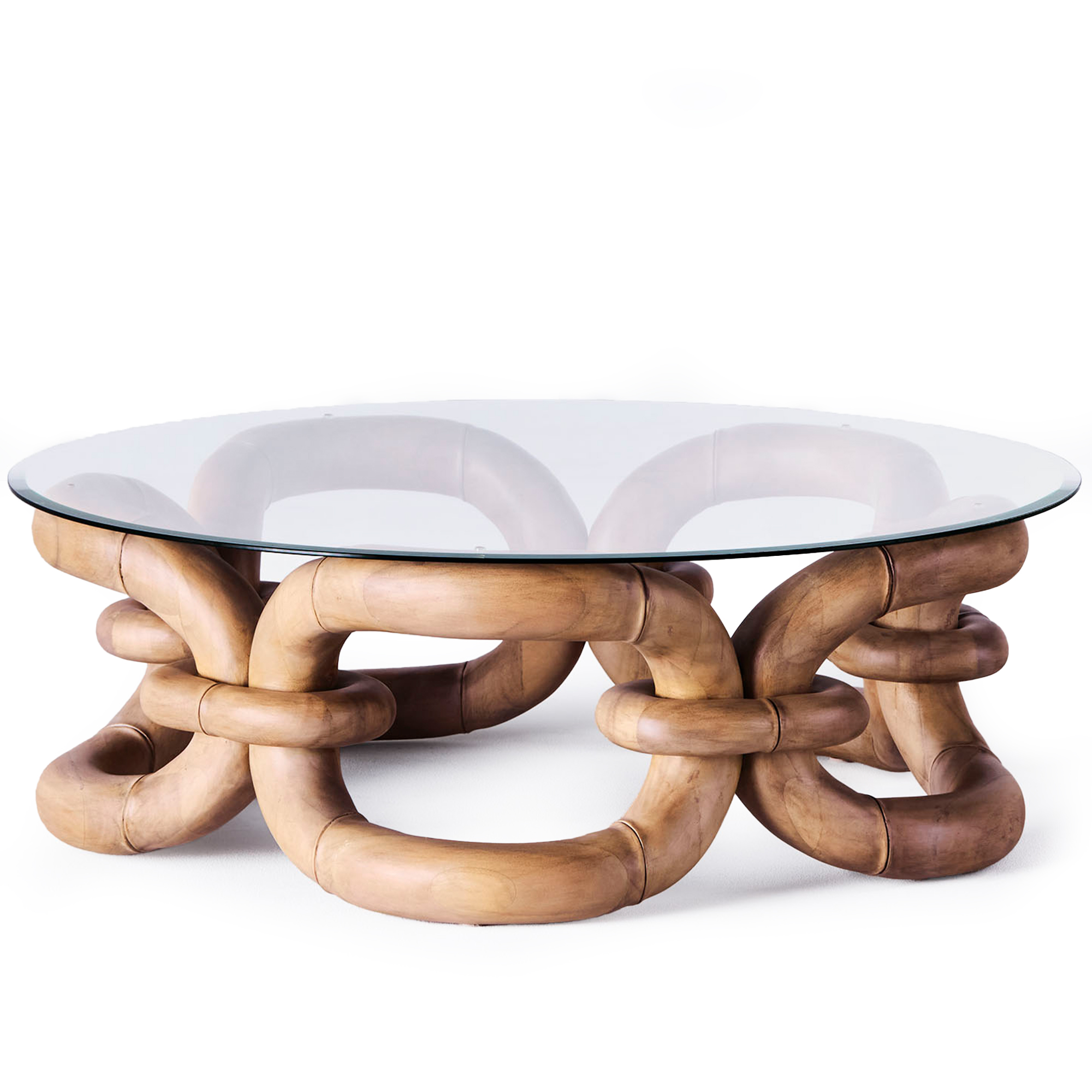 Bamboo Bracelet Sofa Table är ett soffbord formgivet av Edin & Lina Kjellvertz för Dusty Deco. Bordet har ett kedjeliknande underrede i mahogny med en rund bordsskiva i härdat glas. Inspirationen till bordet kommer från ett guldarmband som designerduon fyndat på en loppmarknad. Bamboo Bracelet Sofa Table är ett unikt soffbord som blir en iögonfallande detalj till soffgruppen. Finns i två utföranden.