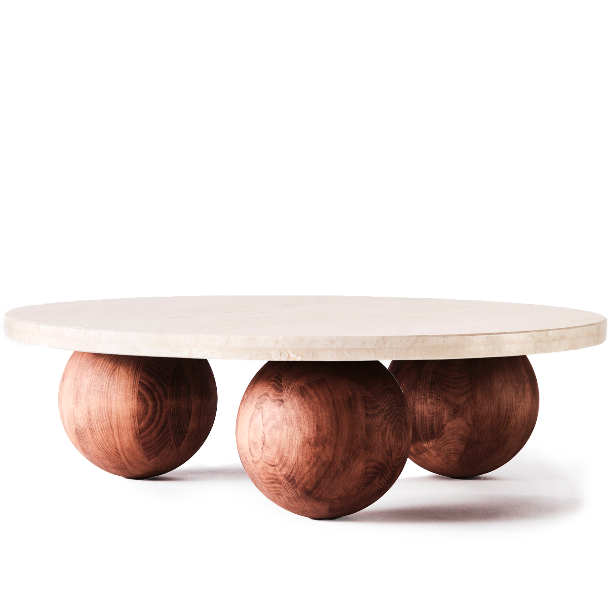 Sphere Round Sofa Table är ett soffbord med en design som förenar enkelhet och komplexitet. Bordet har överdimensionerade sfärer av mörkbetsad bok som stödjer en massiv bordsskiva i travertinmarmor. Bordsskivan, som är 5 cm tjock, har en vit nyans med ljusare marmoreringstoner. Eftersom marmor är ett naturmaterial, är varje skiva unik med variationer i struktur och färg. Sphere Round Sofa Table finns i två storlekar, 100 och 120 cm i diameter. I samma serie finns även en fyrkantig version, vilket erbjuder fler alternativ för olika inredningsstilar.