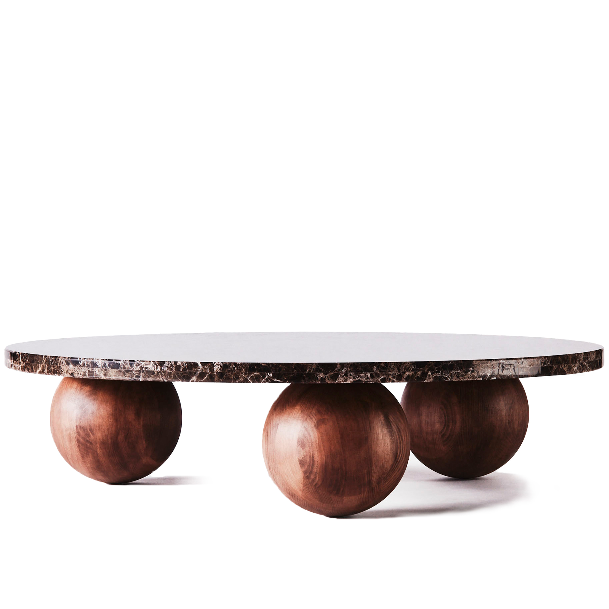 Sphere Round Sofa Table är formgivet av Edin och Lina Kjellvertz för Dusty Deco och framhäver en unik kombination av enkelhet och komplexitet i sin design. Detta stilfulla soffbord är perfekt för moderna vardagsrum och är utformat med en tjock, 5 cm bordsskiva i luxuriös Emperador-marmor känt för sin djupa mörbruna nyans. Marmoreringen i ljusare nyanser av brunt tillför en levande och elegant karaktär till bordet, där ingen skiva är den andra lik. De sfäriska benen är tillverkade i mörkbetsad ask som bidrar till en stadig och estetiskt tilltalande grund.