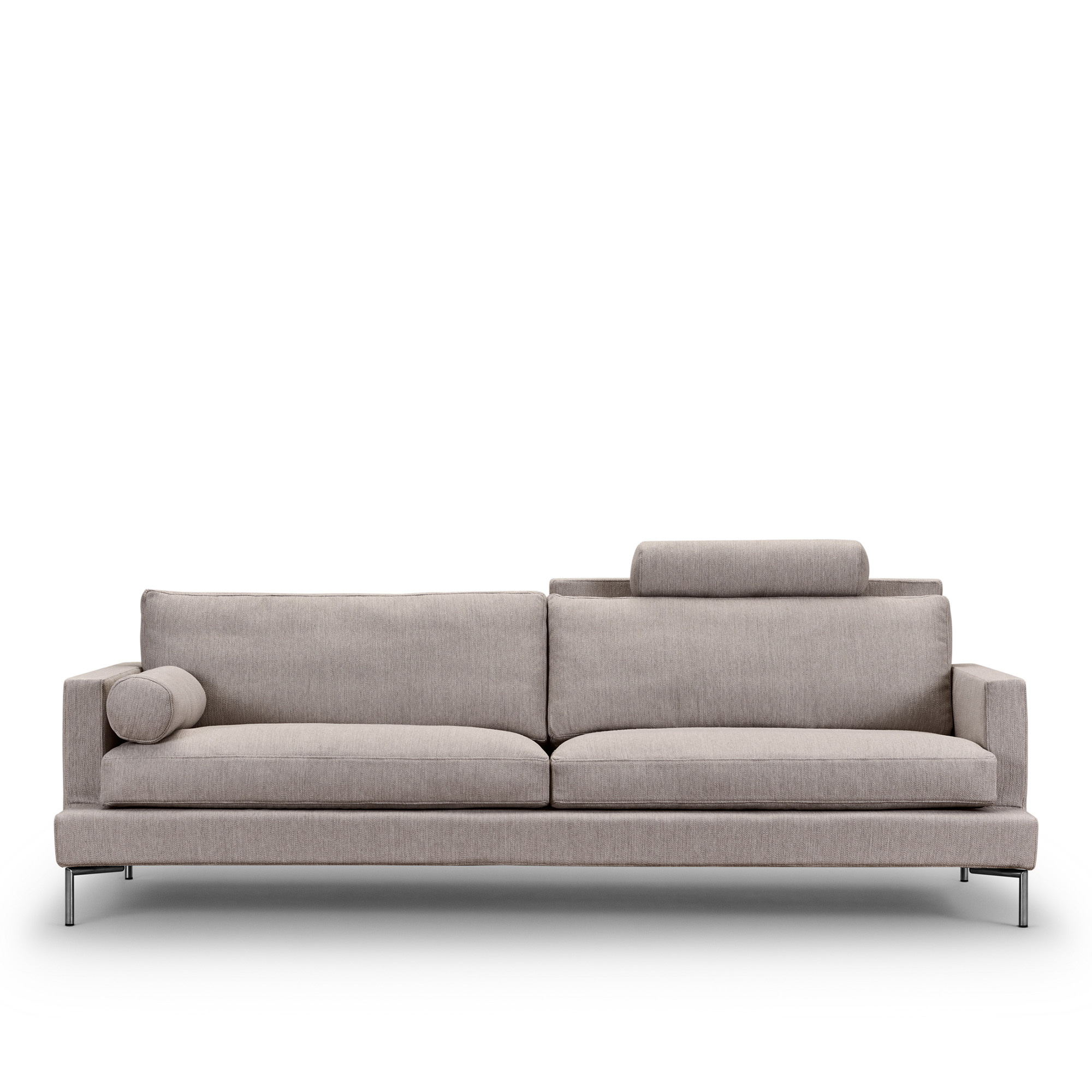 Soffan kommer med inställning av ryggläge, ryggkuddar tillverkade av dun och skumkärna samt vinklade standardben i borstat rostfritt stål, placerade i hörnen. Med soffan medföljer 1 eller 2 arm-/nackstöd Ø17 x 63 cm.