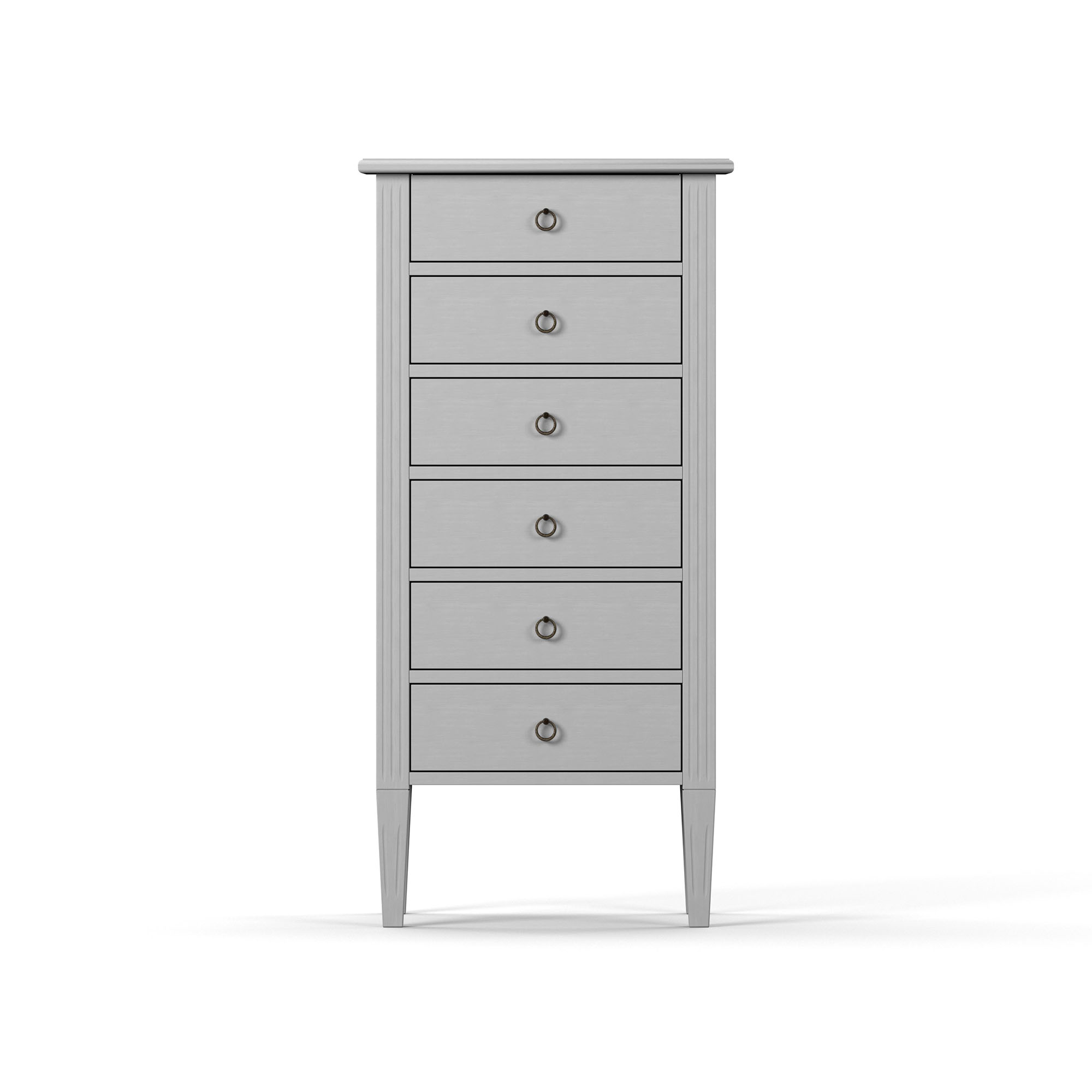 Stockholm är en stilren, klassisk och tidlös serie möbler från Englesson. Formspråket är skandinaviskt och stramt, samtidigt sofistikerat med en känsla av hemtrevlig elegans, och skänker en exklusiv känsla till en rad olika typer av hem och inredningsstilar. Möblerna ur serien är handmålade och dess rena linjer skapar en välavvägd balans mellan det gamla och det nya. Denna höga och smala hallbyrå består av 6 lådor som lämpar sig utmärkt för förvaring av exempelvis mössor, sockor och vantar. I serien ingår även ytterligare en hallbyrå i ett lägre och bredare utförande.