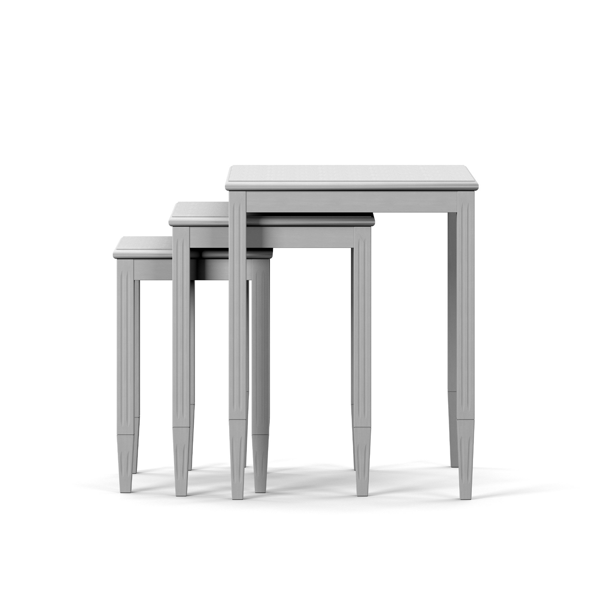 Stockholm är en stilren, klassisk och tidlös serie möbler från Englesson. Formspråket är skandinaviskt och stramt, samtidigt sofistikerat med en känsla av hemtrevlig elegans, och skänker en exklusiv känsla till en rad olika typer av hem och inredningsstilar. Möblerna ur serien är handmålade och dess rena linjer skapar en välavvägd balans mellan det gamla och det nya. Satsborden ur serien består av tre bord i minskande storlek – 47x47x60 cm, 39x39x53 cm och 31x31x46 cm – och är tillverkade i massiv furu och MDF. Finns tillgänglig i flera utföranden.