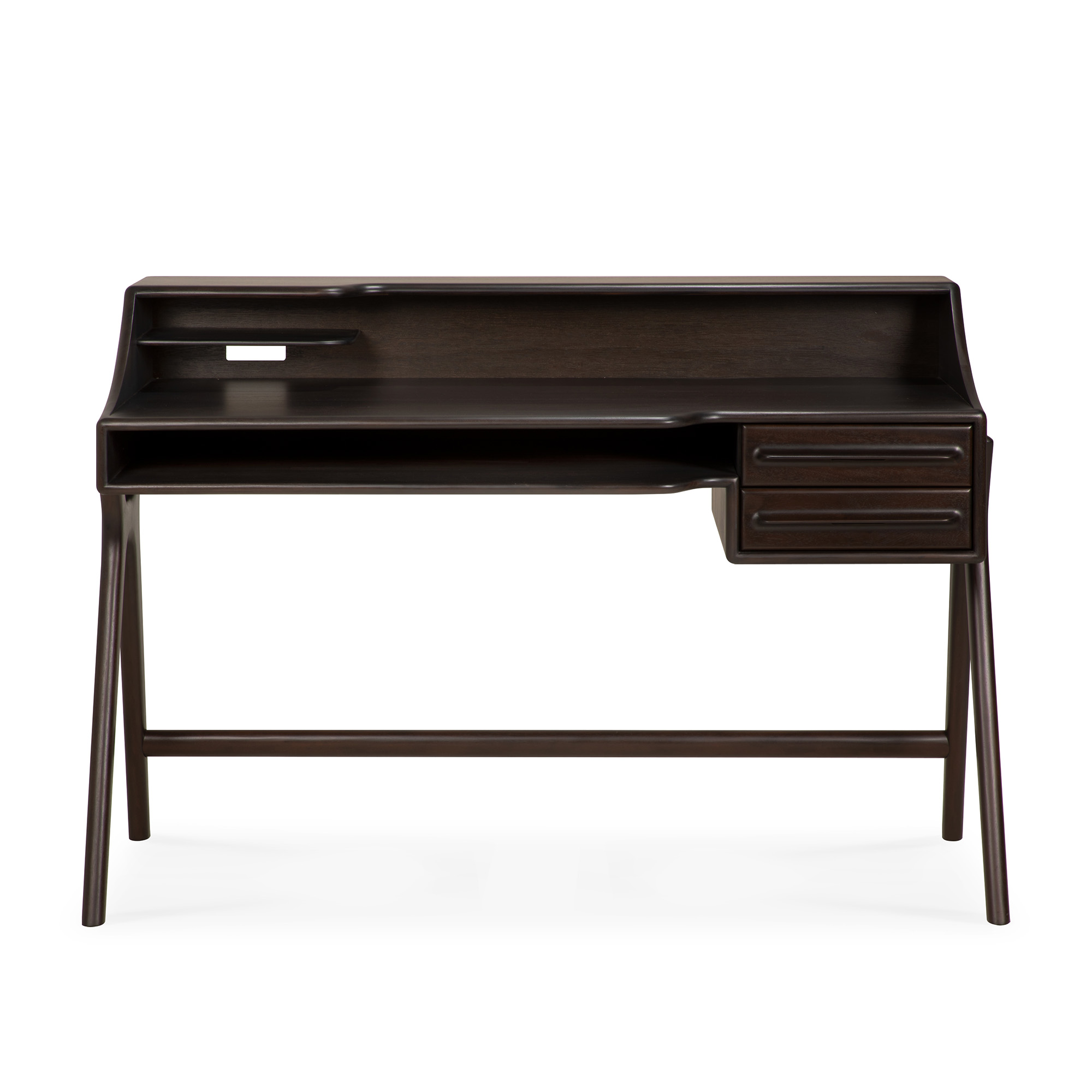 Flow Desk är ett skrivbord från det belgiska varumärket Ethnicraft. Formgivet av Alain van Havre kombinerar skrivbordet ett funktionellt arbetsuttryck med en skulptural konstruktion. Flow är tillverkat av betsad mahogny och har en lackad yta som skyddar träet och samtidigt framhäver dess struktur. Med måtten 140 x 55 x 96 cm är skrivbordet proportionerat för hemmakontor och arbetsytor där både design och funktion är viktiga. Flow Desk har två lådor med diskreta grepp placerade på undersidan, vilket ger dold förvaring för kontorsartiklar och dokument utan att störa den visuella helheten. Det tydliga formspråket med rundade linjer och vinklade ben gör att möbeln fungerar lika väl fristående som placerad mot en vägg. Den kan användas i arbetsrum, vardagsrum eller som skrivbord i större sovrum.