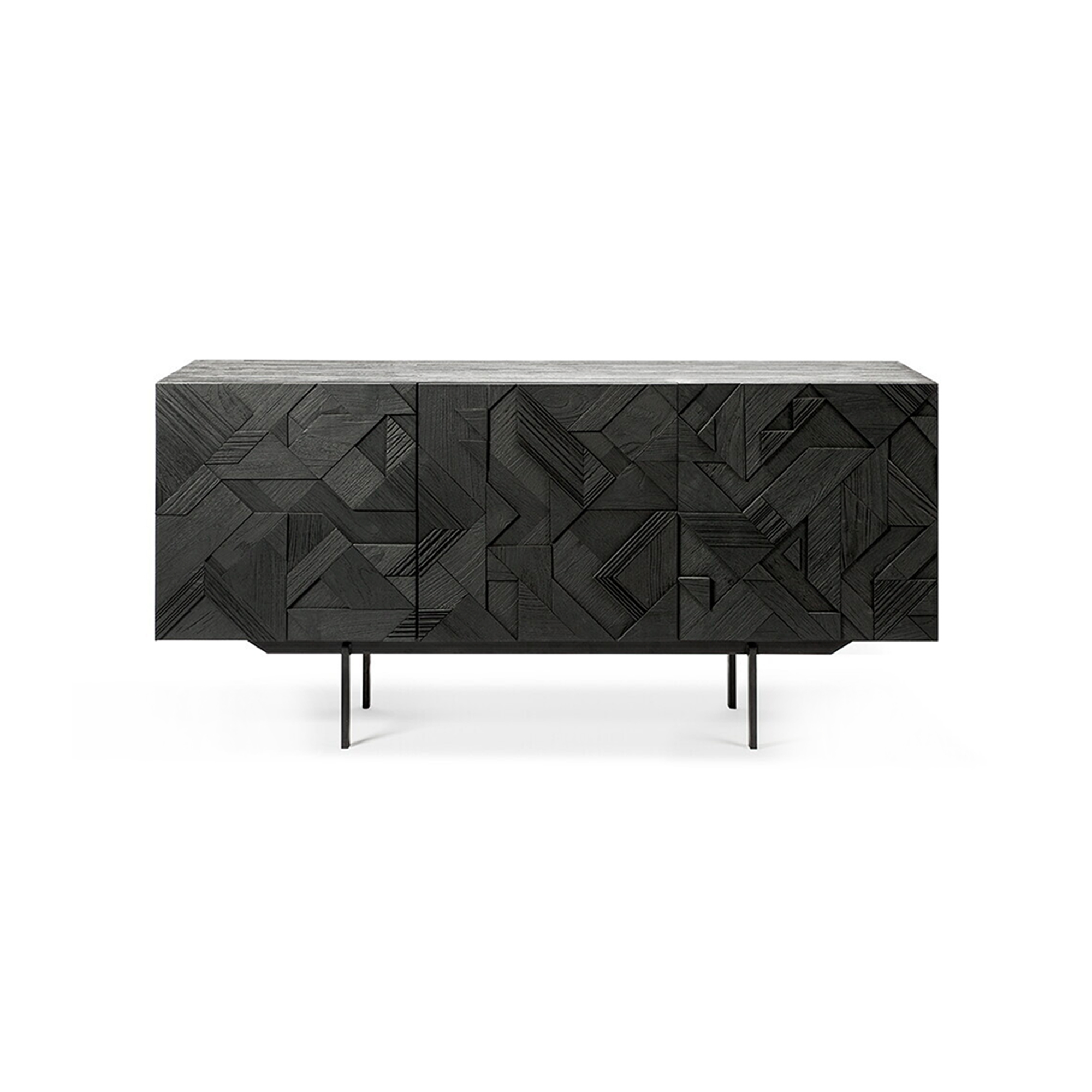 Teak Graphic Black Sideboard är formgivet av Alain van Havre för Ethnicraft. För att skapa liv i designen började han kombinera olika triangulära former och skapade en grafisk design på dörrarna. Genom att använda flera lager av material ger det en känsla av djup och dynamik till sideboardet. Teak Graphic Black Sideboard finns i flera storlekar.