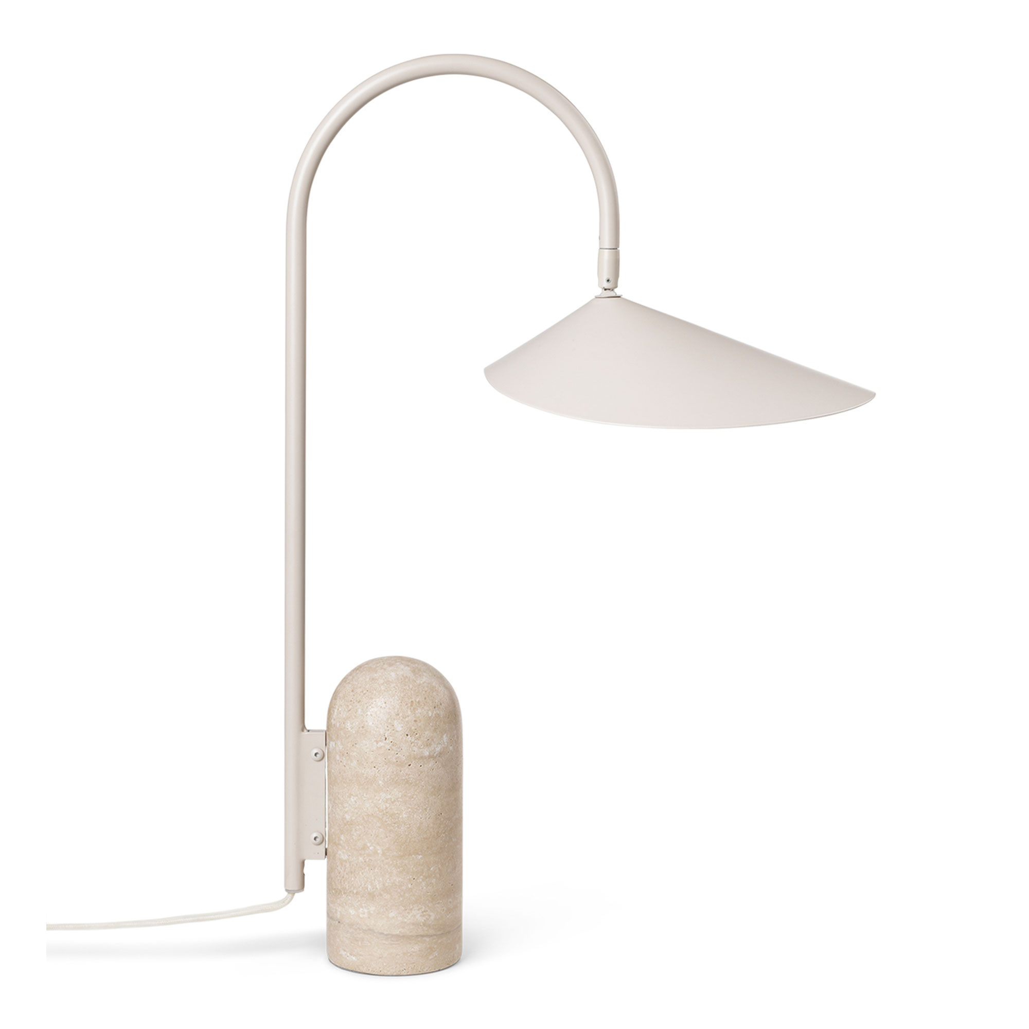 Arum är en bordslampa med fot i marmor eller travertine och skärm i metall från danska Ferm Living. Den stadiga lampfoten ger, i kombination med den organiskt formade lampskärmen, en vacker kontrast och en säregen karaktär till den tidlösa lampan. Lampans konstruktion är ett perfekt avvägt balansspel där lampans arm och skärm väger upp den kraftiga foten. Den ljusa, matta insidan på lampans bladlika skärm ger ett mjukt och jämnt sken. Skärmen kan justeras för att få ett optimalt ljussken för olika miljöer och situationer.