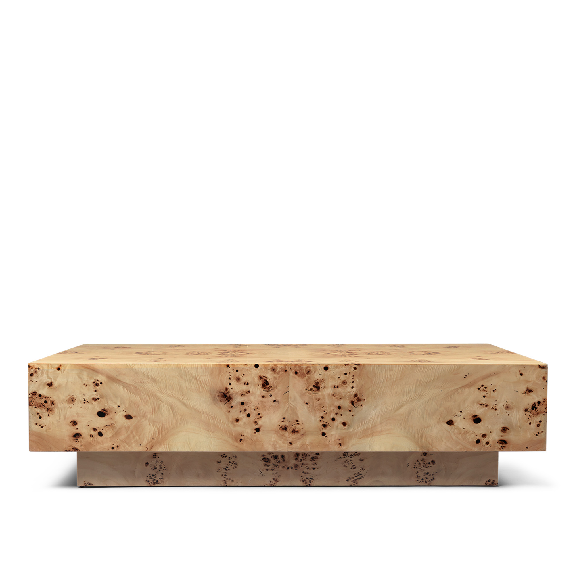 Burl Coffee Table är designad av Ferm Living. Soffbordet kombinerar den rika textur av masurbjörk med de strama, enkla linjerna hos brutalistiska former. Bordet är FSC-certifierad och tillverkad av faner av masurbjörk och MDF-kärna. Detta soffbord ger en djärv men varm designnärvaro till ditt vardagsrum, där den robusta designen balanseras perfekt med elegansen och värmen från träets mönster.