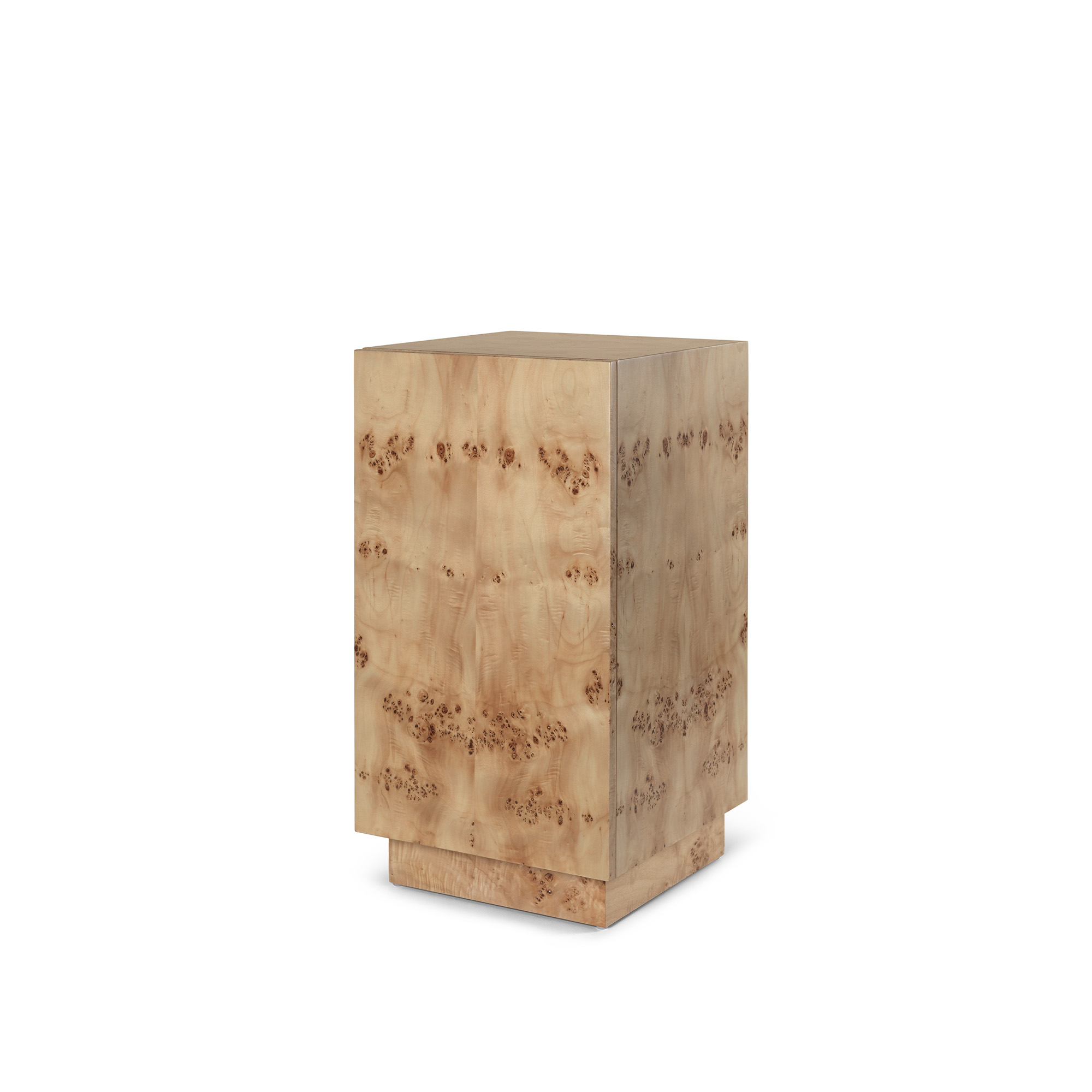 Burl Side Table är formgiven av Ferm Living. Sidobordet har fått sitt namn från det elegant mönstrade FSC-certifierat burlträet som bordet är tillverkat i. Denna mångsidiga och stilrena möbel passar perfekt både som nattduksbord och sidobord, det anpassar sig smidigt efter dina behov. Dess dolda förvaringsutrymme inkluderar en justerbar hylla som kan flyttas efter de föremål som ska förvaras. Den pelarliknande designen utstrålar en elegant uttrycksfullhet som förhöjer helhetsintrycket och stämningen i vilket rum som helst.