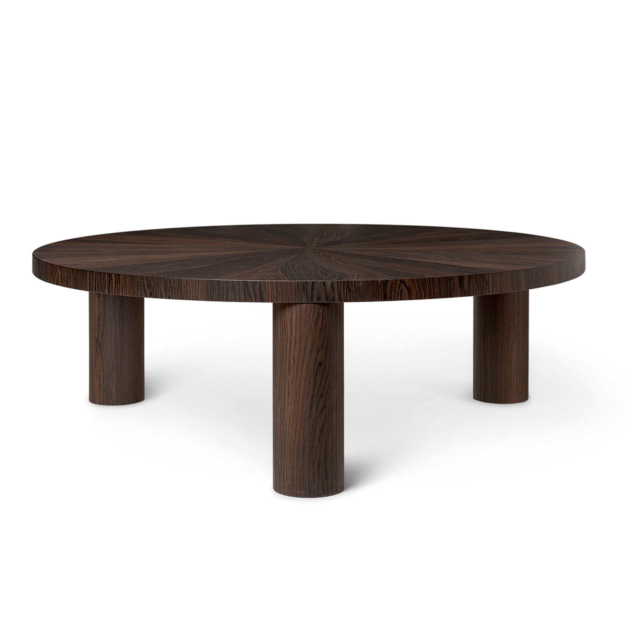 Post Coffee Table är ett soffbord från Ferm Living i rökt ek, tillverkat av MDF-kärna och ekfanér. Den nättare bordsskivan kombinerat med de robusta cylinderformade benen skapar ett stilrent intryck i hemmet. Hantverket tar sig i uttryck genom bordets toppskiva med den svindlande vackra stjärnformationen som skapats genom en speciell teknik där en sammansättning av trädetaljer skapar detta sfäriska mönster.