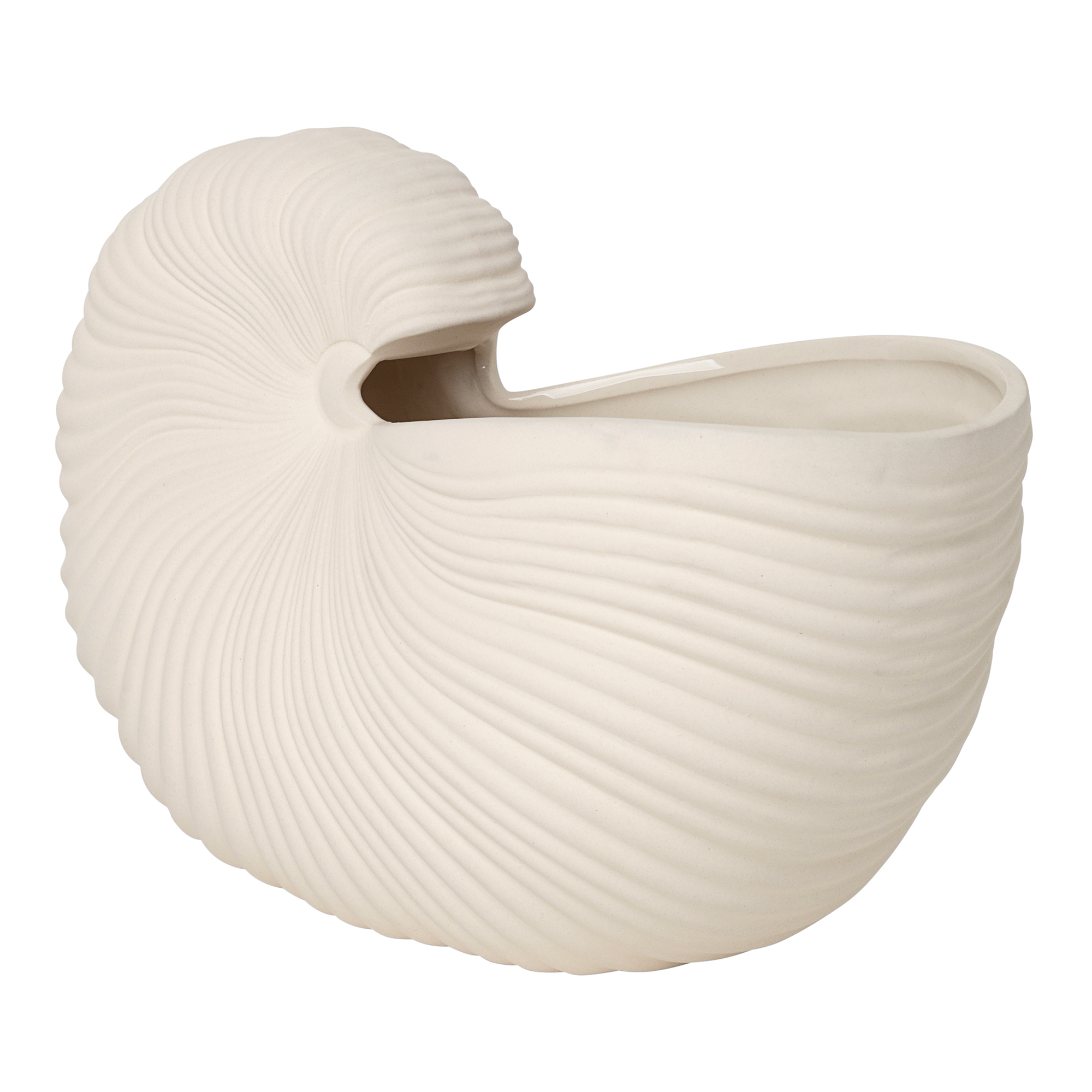 Shell Pot är en skulptural kruka i porslin från danska Ferm Living. Fyll den med dina favoritblommor eller använd den som ett dekorativt prydnadsföremål. Shell Pot är formad som en nautilussnäcka och kombinerar en nutida design med former från naturen. Utsidan på krukan är matt medan dess insida är glaserad.