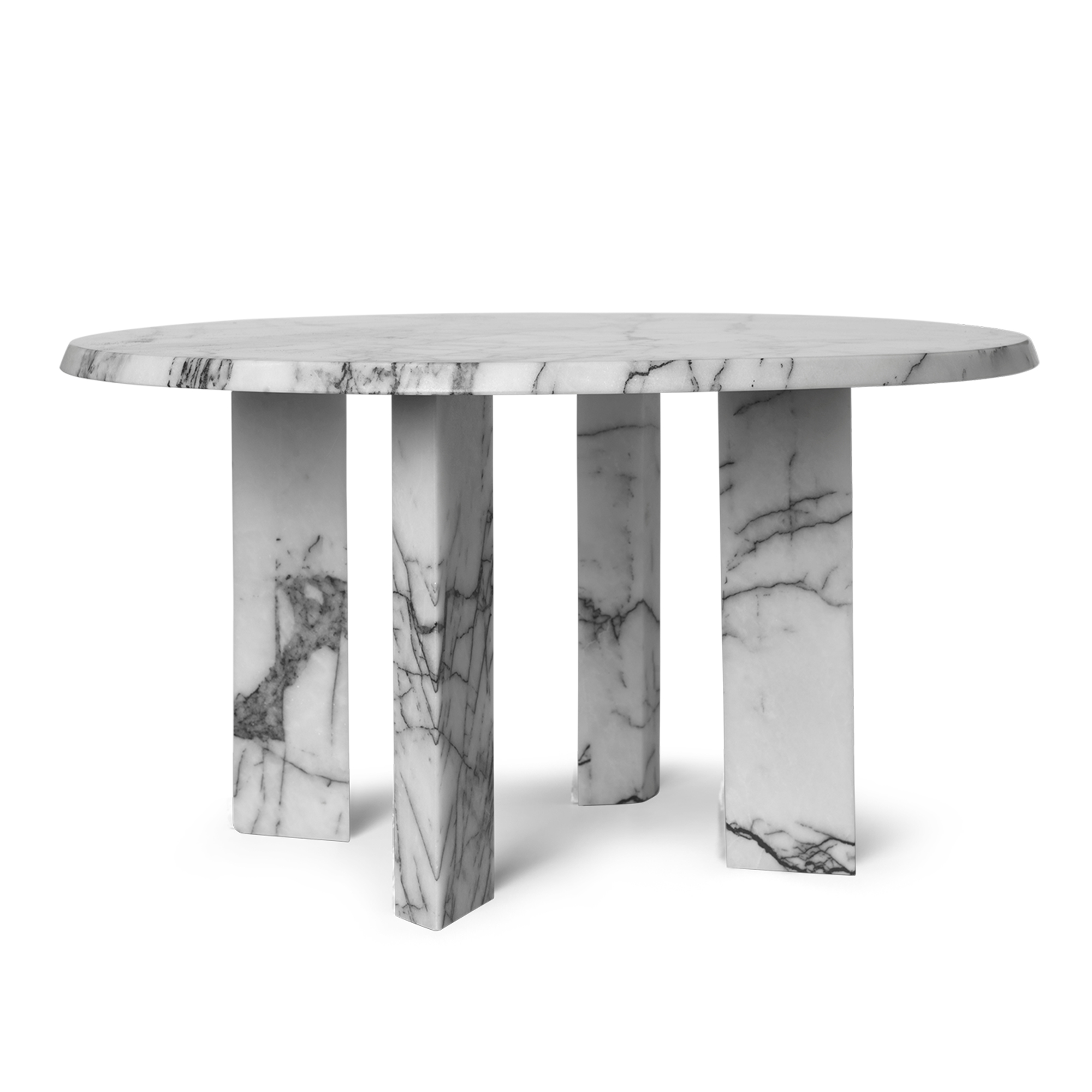 Designen kombinerar rundade former med tydliga arkitektoniska linjer. Den släta, organiska bordsskivan avslutas med en fasad kant, och vilan sker på fyra breda ben med ett grafiskt uttryck. Bordet är tillverkat i massiv marmor, ett naturmaterial vars unika ådringar gör varje exemplar distinkt. Det kan användas fristående eller tillsammans med Taula sidobord, antingen intill eller delvis överlappande, vilket möjliggör en flexibel och komponerad helhet.