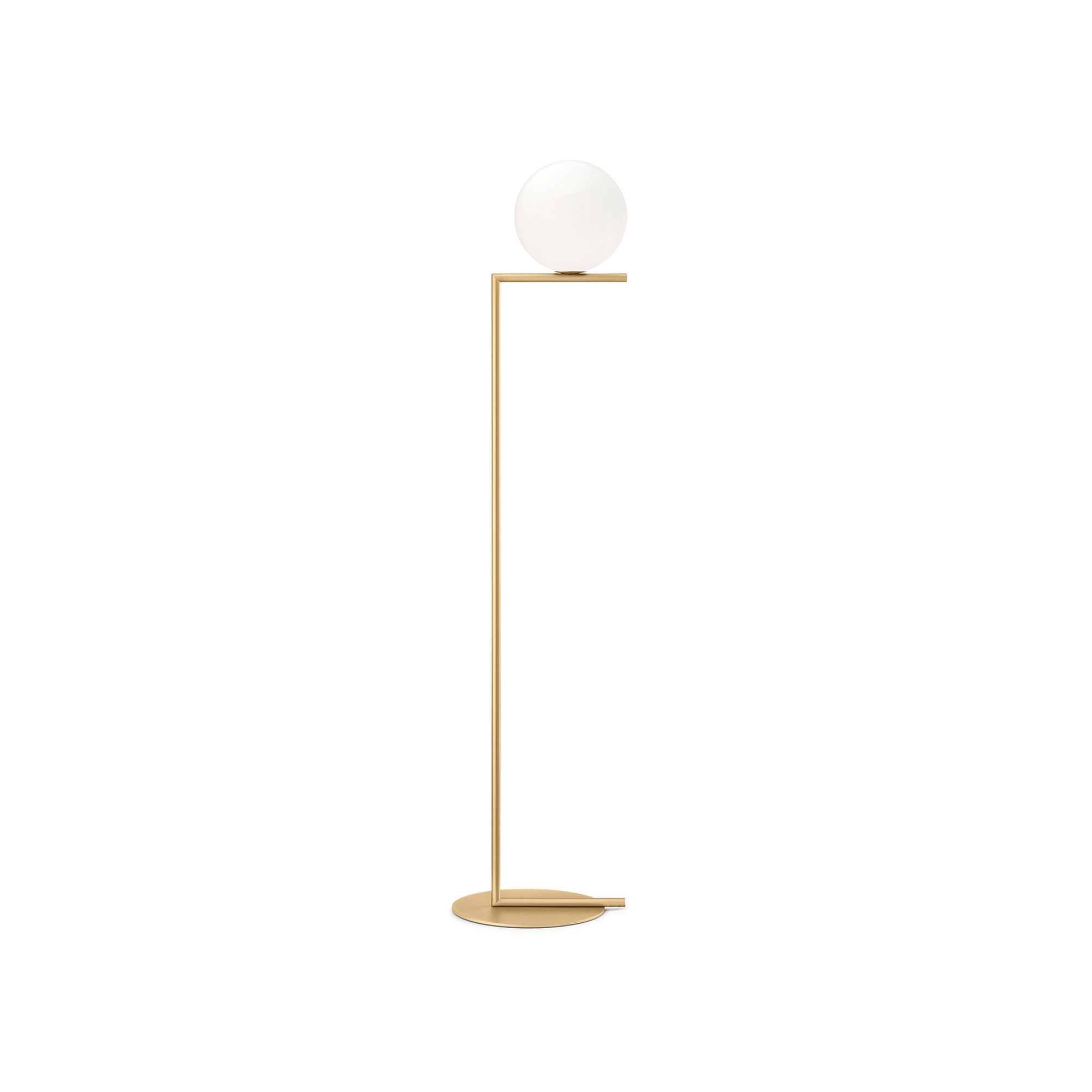 IC Lights har en skärm av handblåst opalglas och en stomme i massiv mässing, krom eller stål. Golvlampan finns i två olika storlekar.