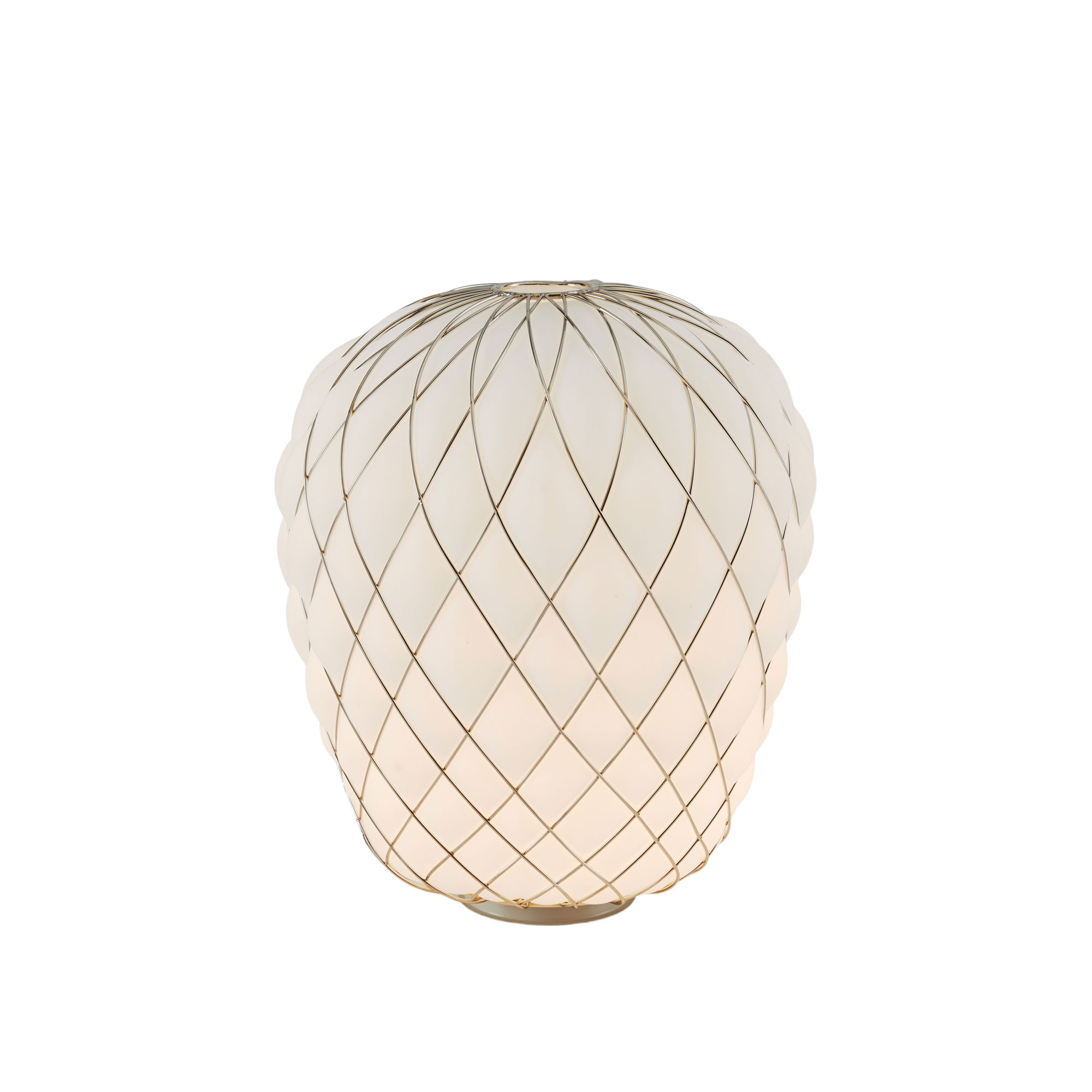 Bordslampan Pinecone, skapad av Paola Navone för FontanaArte, en framstående italiensk tillverkare, lanserades 2016. Denna lampa presenteras i två dimensioner och kan väljas med ett genomskinligt eller mjölkaktigt, syraetsat glas. Designen av Pinecone är tydligt influerad av formen på en tallkotte, vilket dess namn antyder. Den genomskinliga versionen av lampan skapar ett förtrollande mönster av ljus och skuggor i rummet. Å andra sidan, den vita, syraetsade modellen erbjuder en mjuk och enhetlig ljusfördelning. Under tillverkningen blåses glaset inuti en metallstruktur, vilket förhindrar att glaset expanderar fritt och ger en effekt av att glaset strävar efter att bryta sig fri från sin metalliska inneslutning. Metallstrukturen är galvaniserad för att ge ett lysande och slätt yttre.