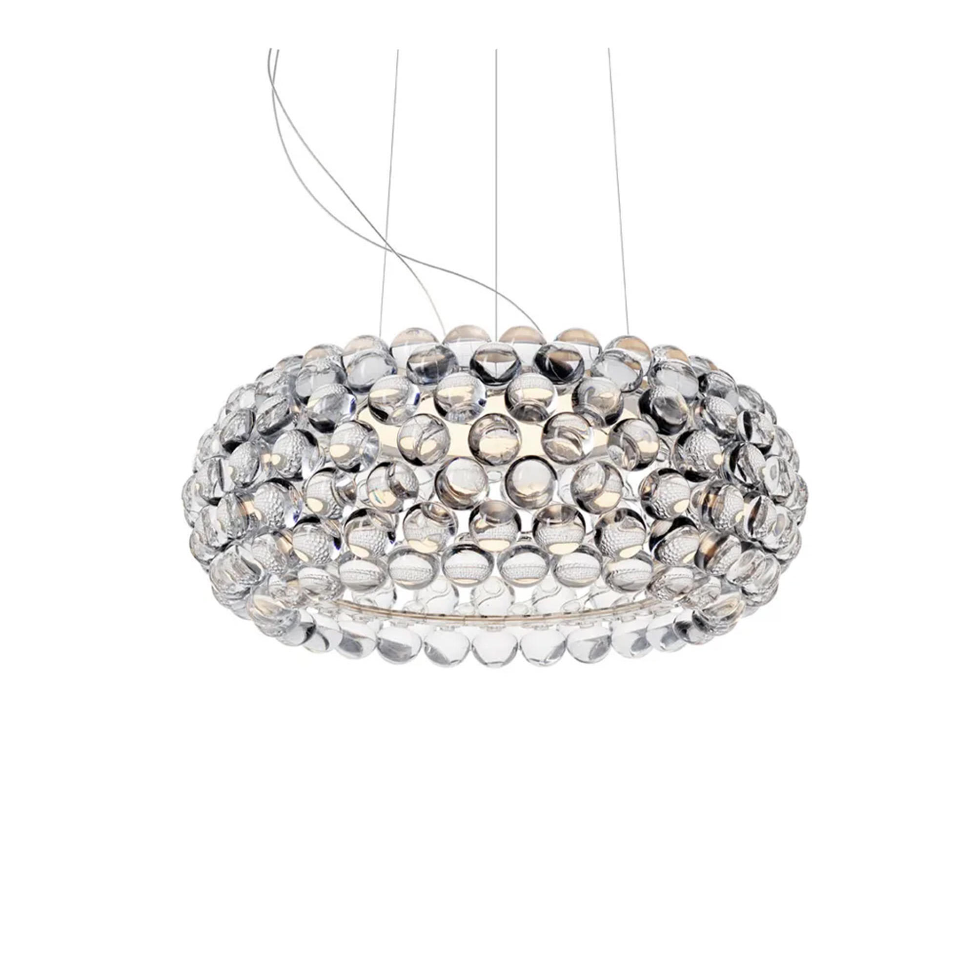 Caboche Plus Media MyLight, pendel formgiven av Patricia Urquiola och Eliana Gerotto för Foscarini. Lampans skärm består av sfärer av transparent polymetylmetakrylat som omsluter den inre skärmen i vitt, satinborstat glas. Den inre skärmen skapar ett trivsamt ljus som reflekteras och sprids genom de kristallika yttre sfärerna. En elegant takkopp i förkromad metall ingår.