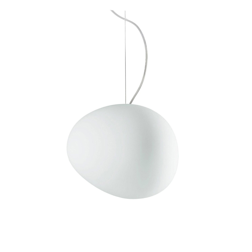 Gregg, en pendel i tre olika storlekar från Foscarini, designad av Ludovica & Roberto Palomba. Taklampan är tillverkad av munblåst syraetsat glas med en sammetslen matt finish, som ger ett behagligt och mjukt ljus. Den asymmetriska och organiska formen ger karaktär till sin omgivning och fungerar således i många olika slags miljöer.
