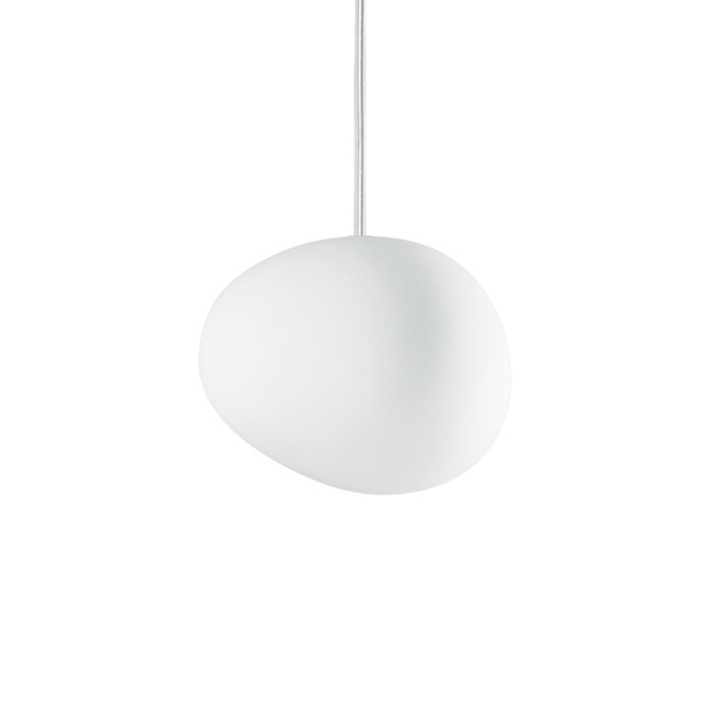 Gregg, en pendel i tre olika storlekar från Foscarini, designad av Ludovica & Roberto Palomba. Taklampan är tillverkad av munblåst syraetsat glas med en sammetslen matt finish, som ger ett behagligt och mjukt ljus. Den asymmetriska och organiska formen ger karaktär till sin omgivning och fungerar således i många olika slags miljöer.
