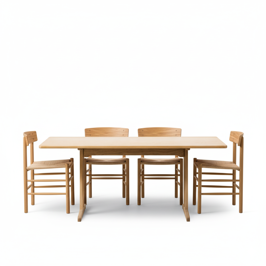 Mogensen C18 matbord med fyra J39 matstolar i oljad ek är en matgrupp från det danska varumärket Fredericia Furniture. Både bord och stolar formgavs av Børge Mogensen år 1947, en period som präglades av hans funktionalistiska syn på design.