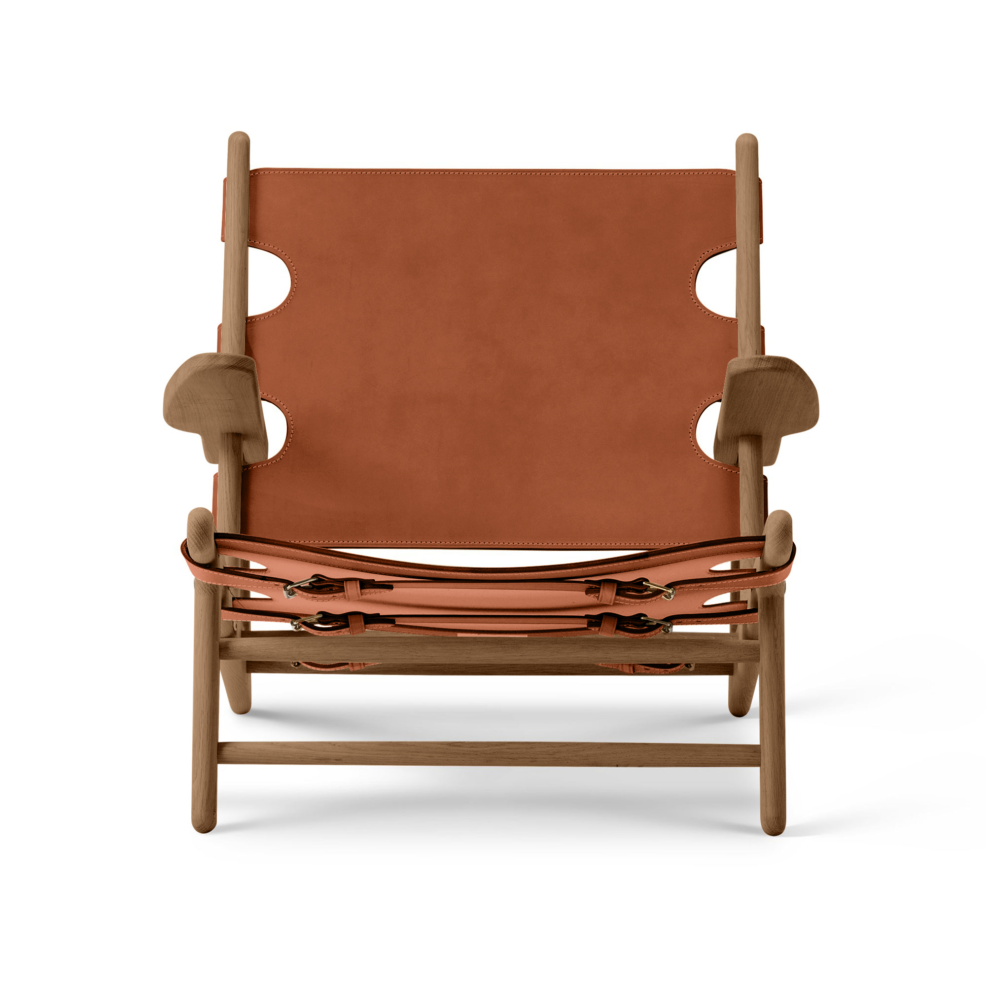 The Hunting Chair är en ikonisk fåtölj från Fredericia Furniture. Fåtöljen är designad av Børge Mogensen år 1950 och är en av hans mest ikoniska verk. Fåtöljen har en exponerad konstruktion bestående av trä och sadelskinn. Det justerbara ryggstödet i läder kan enkelt justeras med hjälp av mässingsspännen. Den här eleganta och klassiska stolen har ett starkt inflytande från andra kulturer, som brittiska Windsor-stolar och den amerikanska Shaker-rörelsen. Med även en inspiration från spanska stolar på grund av sin konstruktion av kraftigt garvat läder. The Hunting Chair är en perfekt inredningsmöbel att ha ifall man önskar ett karaktärsfullt intryck i hemmet.