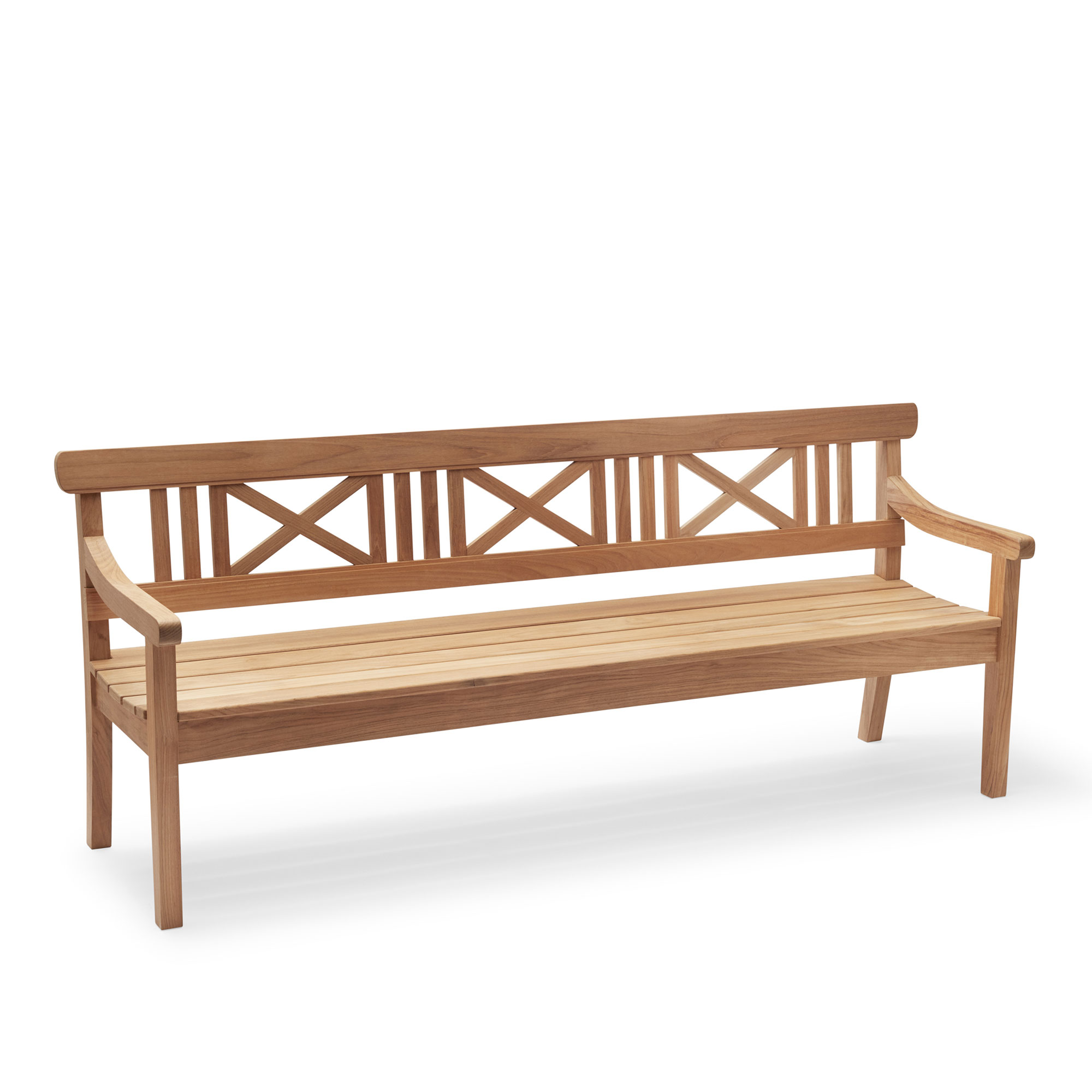 Drachmann Bench är formgiven av Bent Santesson för Fritz Hansen. Trädgårdsbänken ingår i kollektionen Drachmann, vilket är är själva sinnebilden av klassisk, skandinavisk trädgårdsmöbeldesign. Den tidlösa möbelklassikern med det välkända krysset i ryggen har nu mer än 25 år på nacken och tillhör fortfarande våra mest populära möbler. Den är beviset på att det även när det gäller utemöbler finns verkliga klassiker. Serien är formgiven av Bent Santesson. De flesta av Fritz Hansens möbler tillverkas av teak, dels för att teaken har ett tilltalande utseende men även tack vare dess goda egenskaper. Träet har vackra färgskiftningar i mörka och gyllene toner. Den höga halten av naturligt impregnerande oljor gör teaken motståndskraftig mot röta och svampangrepp. Därför är teak ett idealiskt material för både inom- och utomhusmöbler. Jämfört med många andra material har trä många goda egenskaper när det gäller koldioxid och vårt klimat, eftersom det är en förnybar resurs. Fritz Hansens möbler lackeras genom en speciell metod som utvecklats under årtionden. Målningsprocessen består av fem steg och ger en fyllig, glänsande yta med extremt god hållbarhet. Men bearbetningen startar redan före själva lackeringen, då träet torkas till optimal fuktighet för att underlätta arbetet med träet. Det utgör grunden till den eleganta lackade ytan, som lämpar sig särskilt väl för utomhusbruk. Lackerade möbler och utomhusprodukter ska inte utsättas för frost. Under vintern ska de helst förvaras under tak i ett ouppvärmt utrymme t.ex. i garaget eller i källaren.